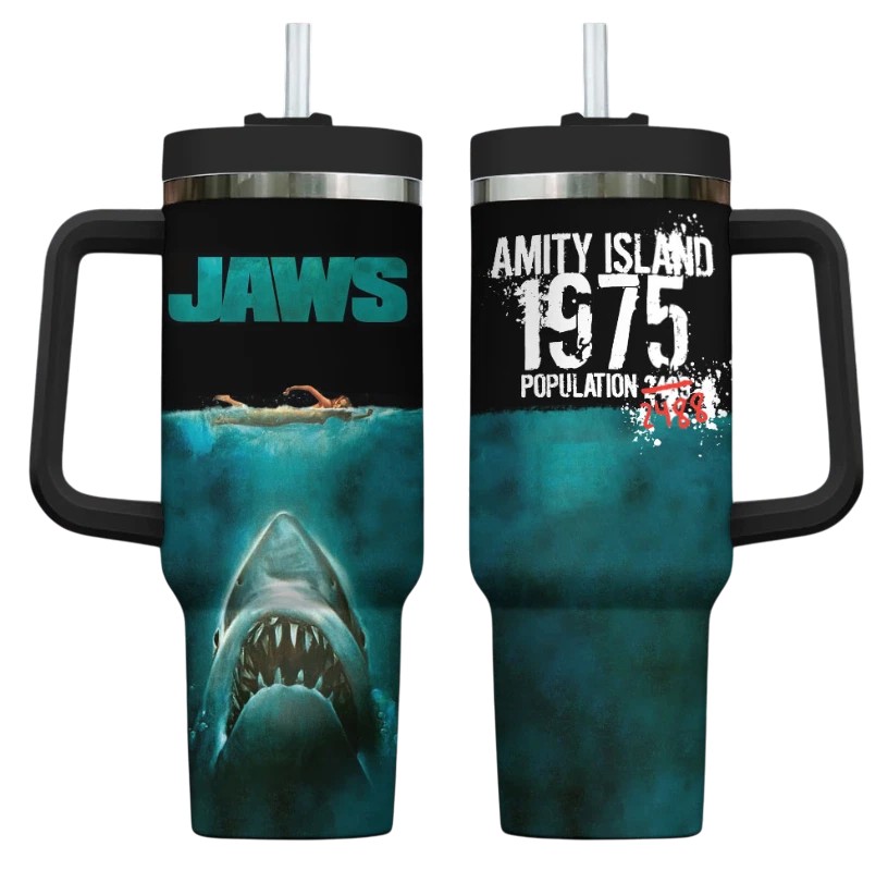 Celebrate the 50th anniversary of Jaws with this chilling tumbler—perfect for keeping your drinks cool, just like the waters of Amity Island!