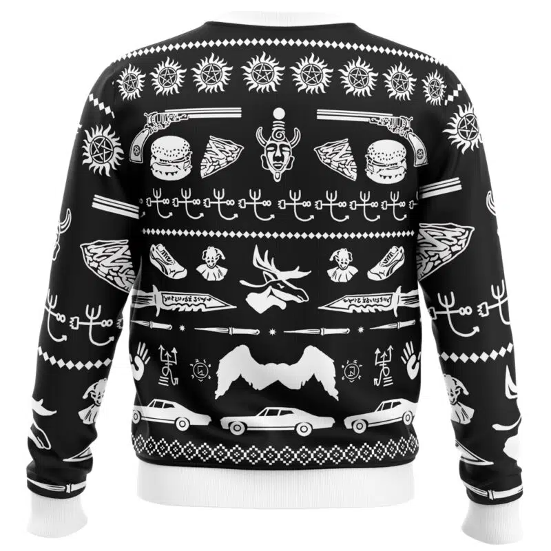 Have a very Supernatural Christmas with this intricately designed sweater, featuring angel wings, iconic symbols, and a touch of hunter charm!