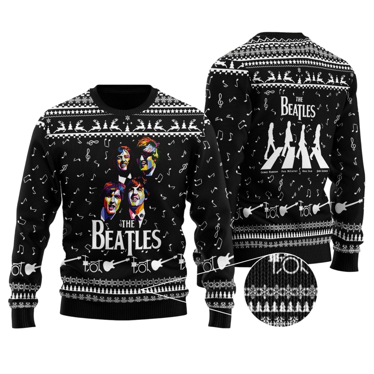 Rock your holiday look with this stylish Beatles Christmas sweater! Featuring vibrant portraits of the Fab Four, festive music note patterns, and the iconic Abbey Road silhouette on the back, this black sweater is perfect for any fan of the legendary band.