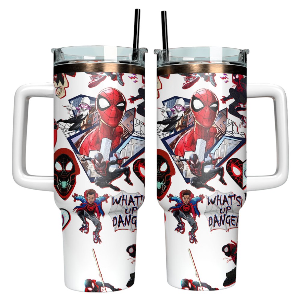 Swing into action with this Spider-Man-themed tumbler—featuring Miles Morales, Gwen Stacy, and Peter Parker, perfect for superhero fans!