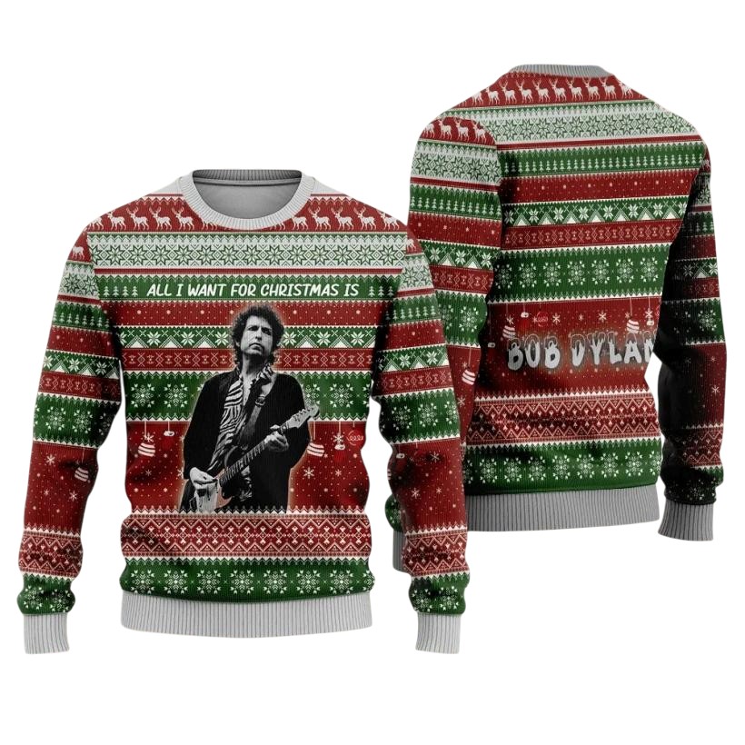 Bring music to your holiday celebrations with this festive Bob Dylan sweater! Featuring the phrase ‘All I Want for Christmas Is Bob Dylan,’ seasonal patterns, and a bold image of the iconic musician, this sweater is perfect for fans spreading Christmas cheer.
