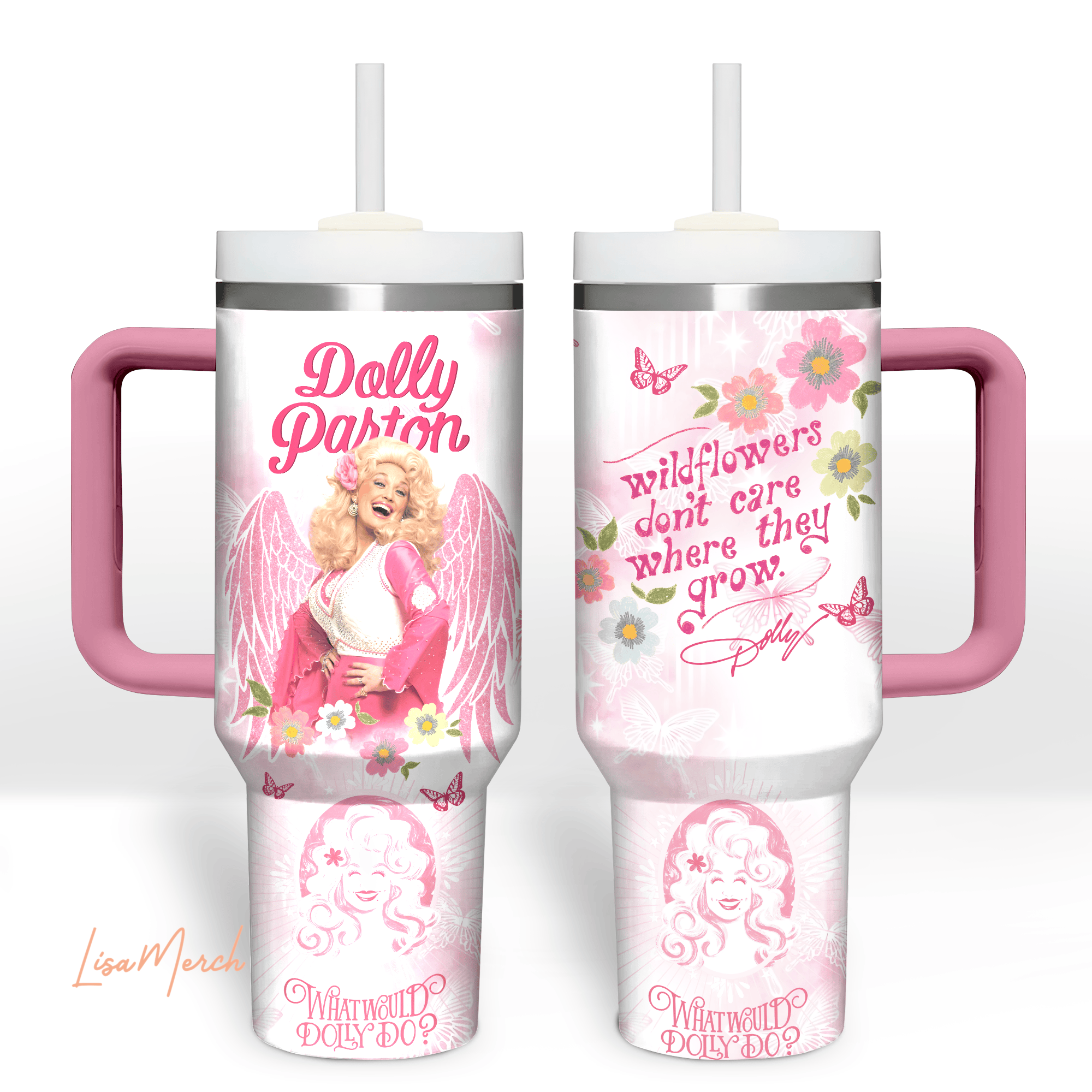 Channel your inner Backwoods Barbie with this charming Dolly Parton tumbler! Decked out in soft pink hues with playful illustrations, inspiring quotes like *’What Would Dolly Do?’* and *’In Dolly We Trust,’* and adorable accents like boots, butterflies, and coffee cups, this tumbler is a sweet tribute to Dolly’s fun-loving spirit and wisdom!