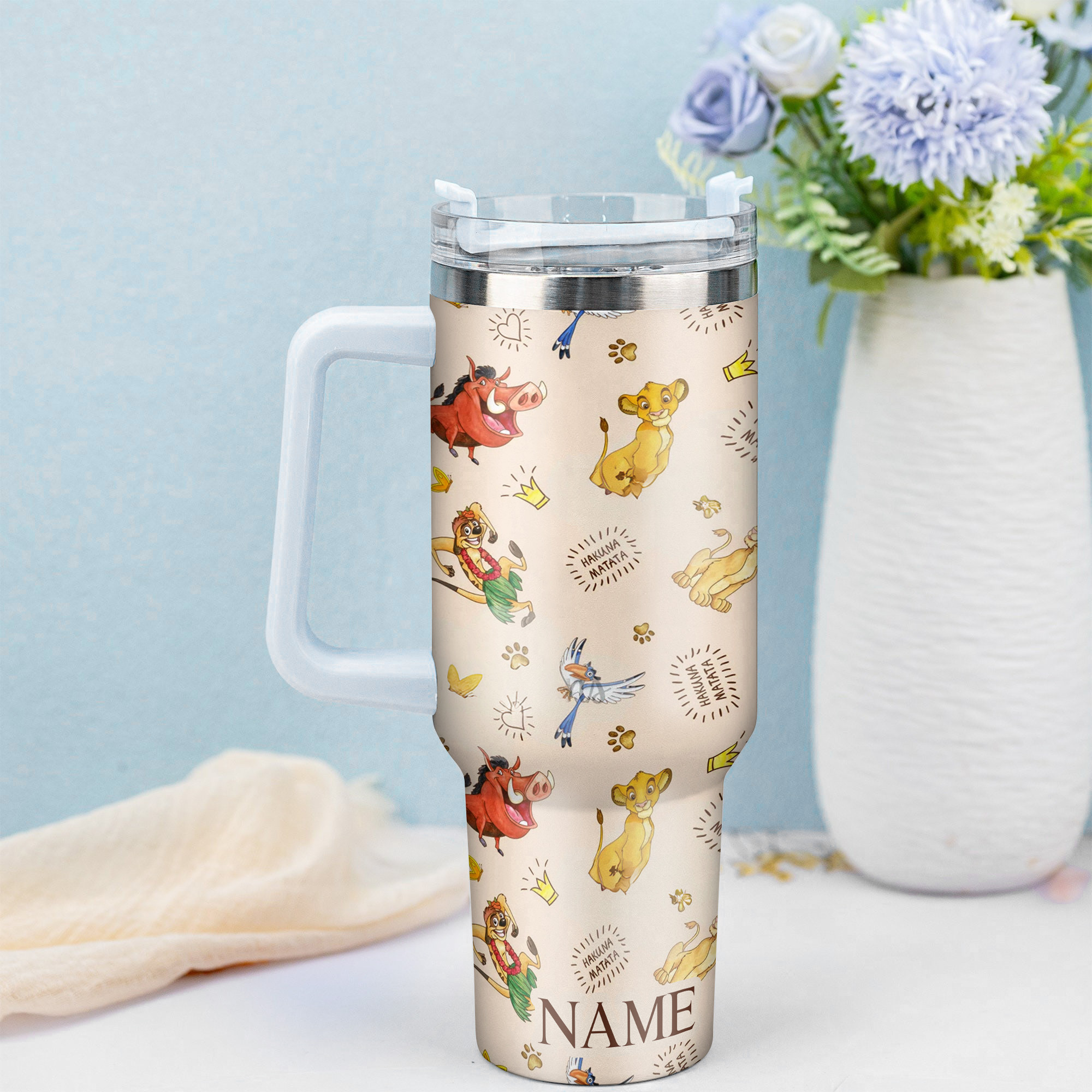 Embrace the carefree spirit of Hakuna Matata with this charming Lion King tumbler! Featuring playful designs of Simba, Timon, Pumbaa, and Zazu, it’s the perfect customizable accessory for fans of all ages.