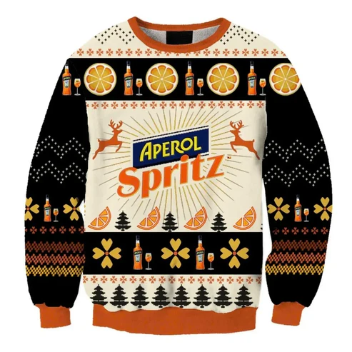 Holiday sweater bursting with Aperol-on-summer vibes — bright, zesty, upbeat energy for anyone who brings sunshine to winter parties.