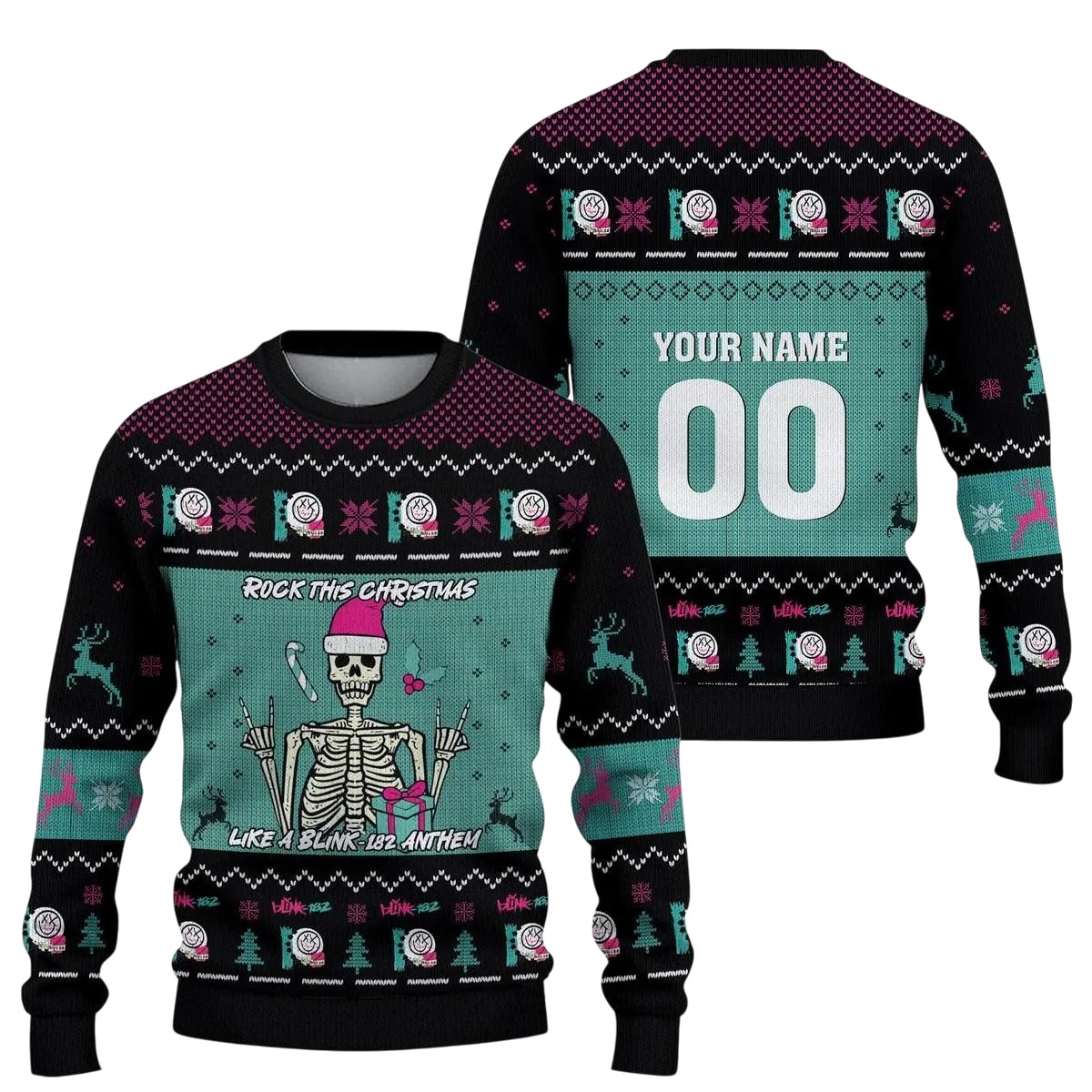 Rock this Christmas like a Blink-182 anthem with this customizable holiday sweater—add your name and number for a personal touch!