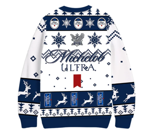Michelob Ultra winter sweater with crisp blue-and-white patterns — a clean, sporty holiday look for beer fans who want festive vibes with light, refreshing energy.