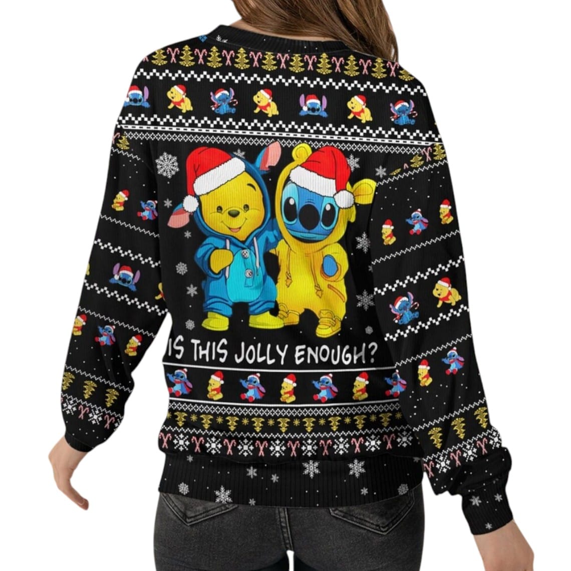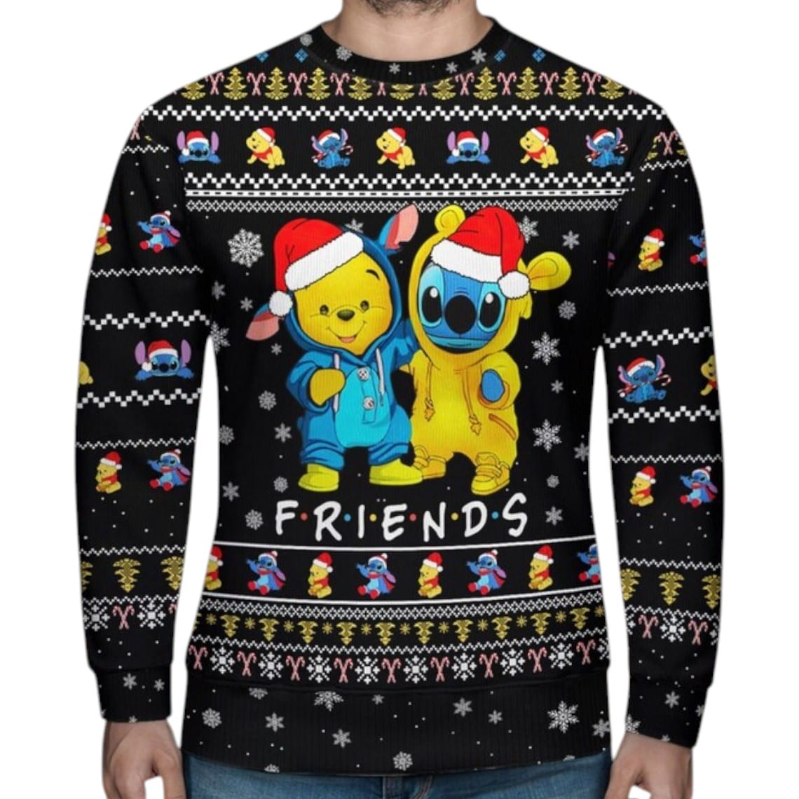 Playful holiday sweater with bold black tones, cute Pooh–Stitch duo, and fun festive energy.