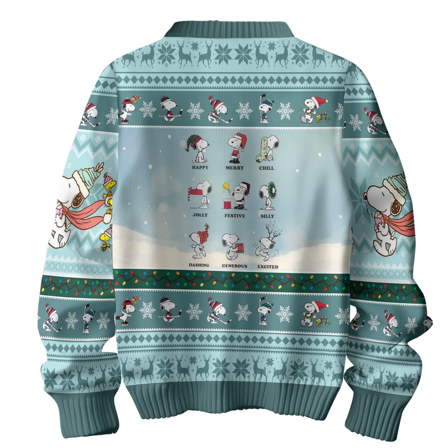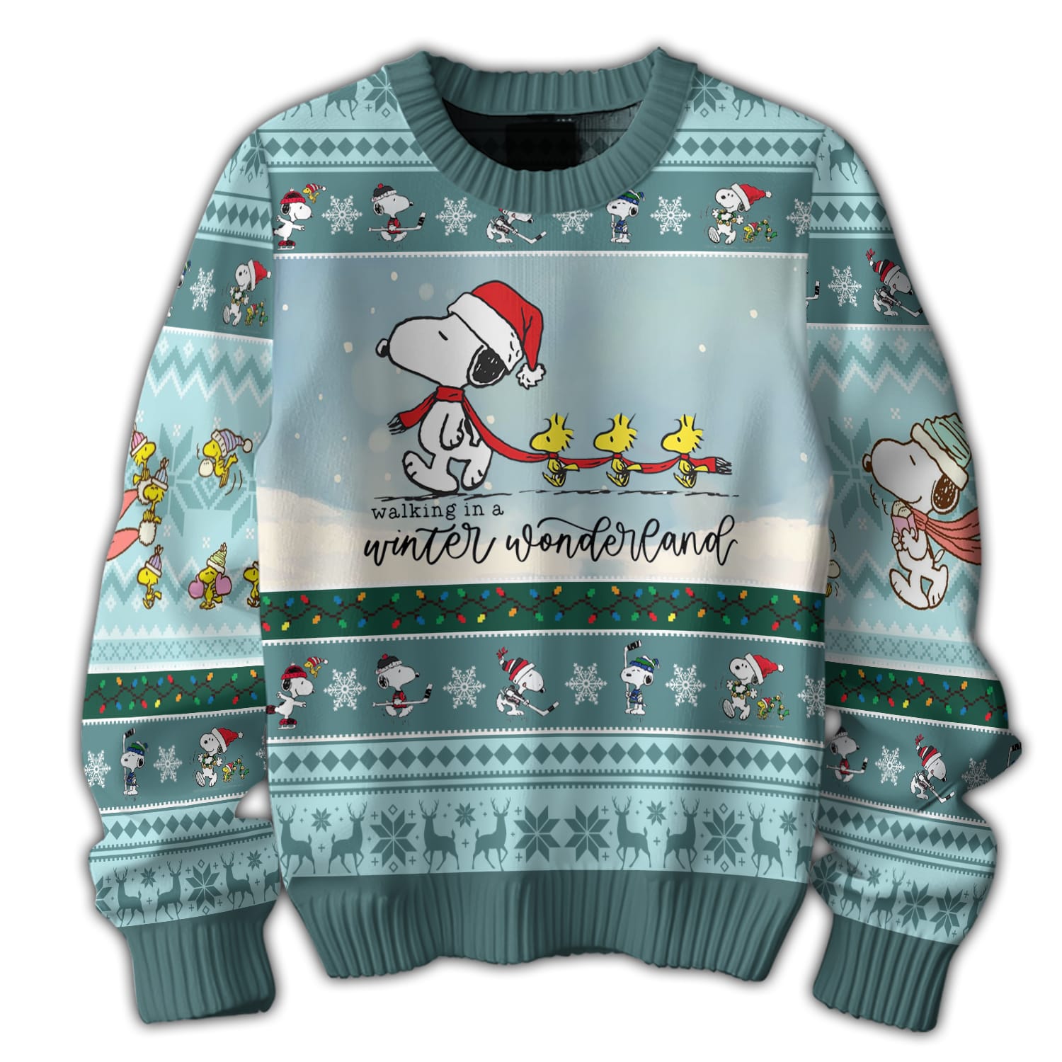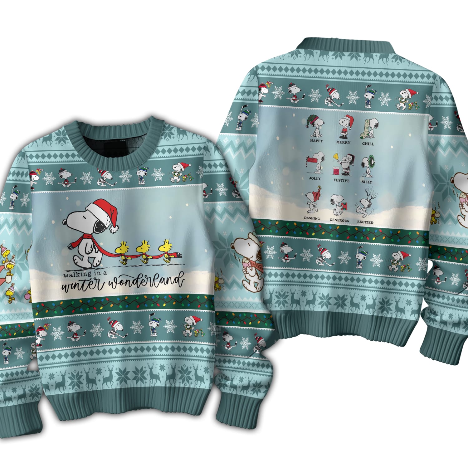 Cozy, durable sweater featuring soft teal tones and a charming Snoopy winter-walk layout; brings gentle holiday warmth and standout whimsical seasonal appeal.
