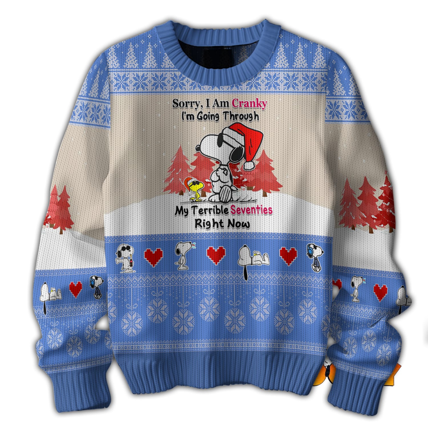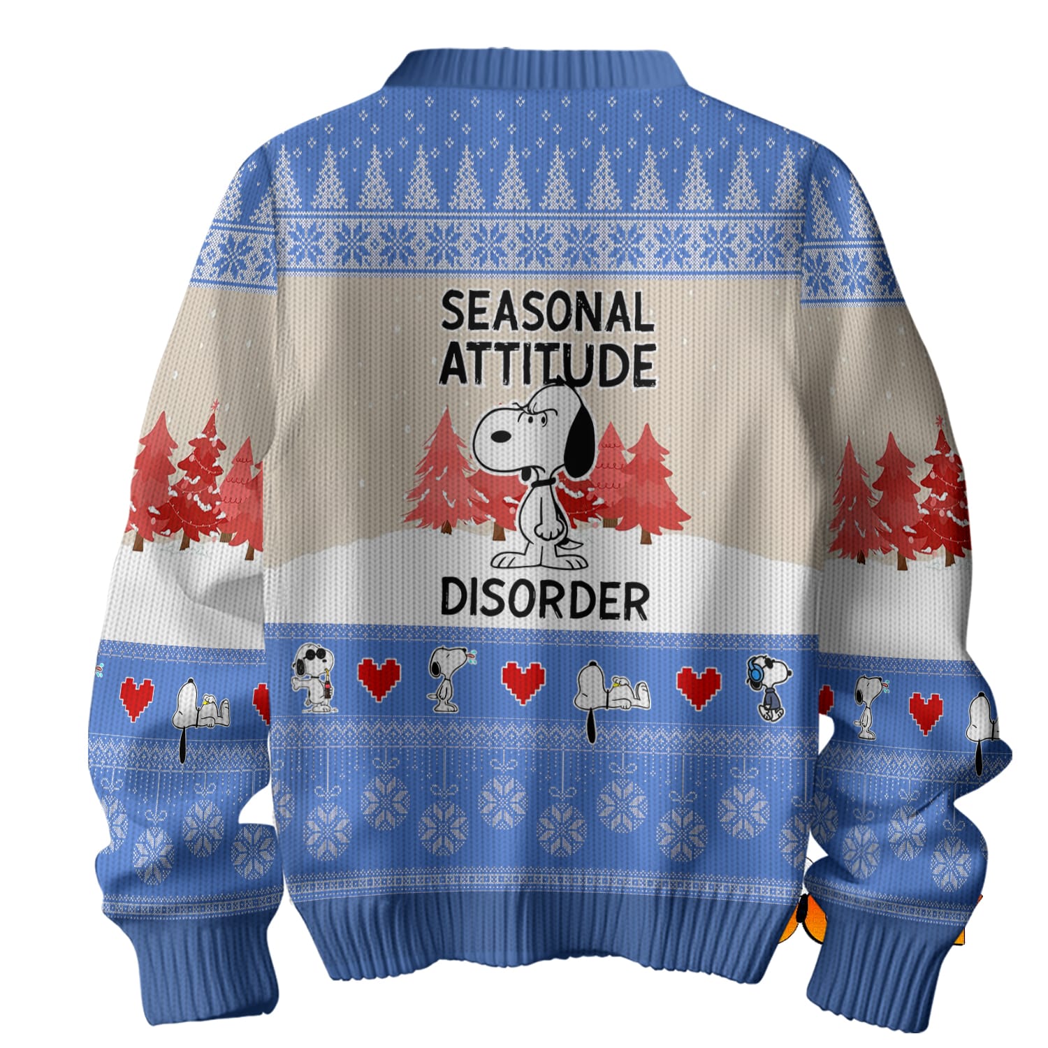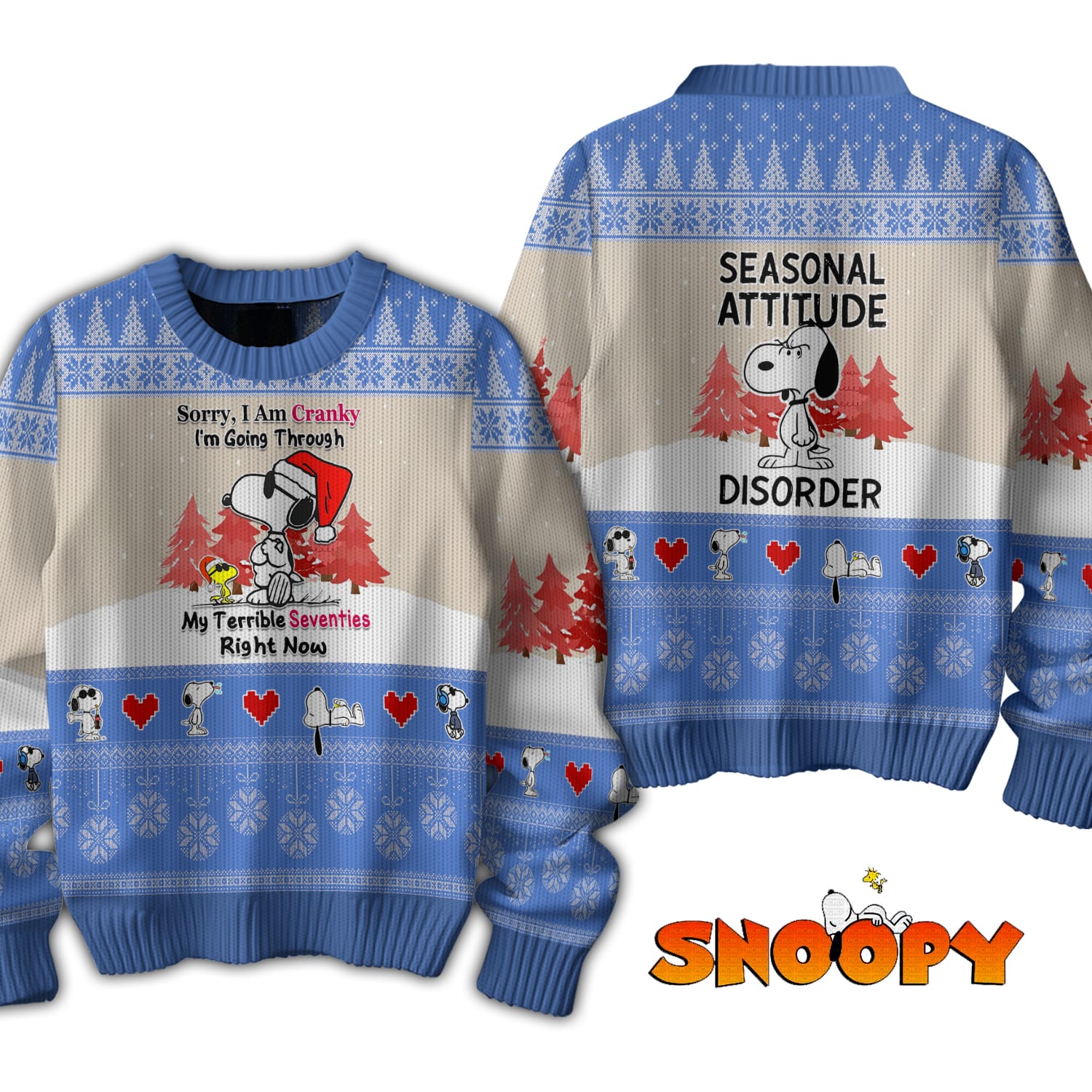 Cozy, durable sweater featuring soft blue tones and bold Snoopy attitude graphics; brings playful humor and standout seasonal personality to any outfit.