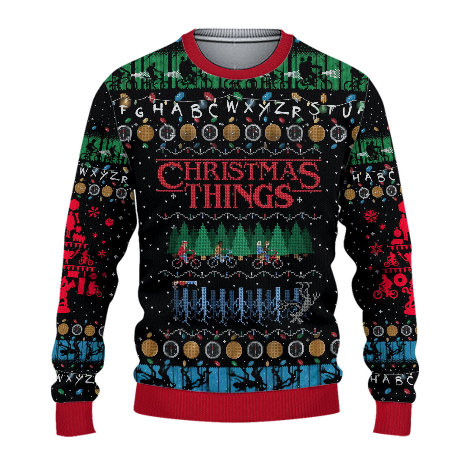 Step into the Upside Down this holiday season with this festive Stranger Things sweater! Featuring “Christmas Things” and “Season’s Greetings from the Upside Down,” it’s perfect for fans of the supernatural series.