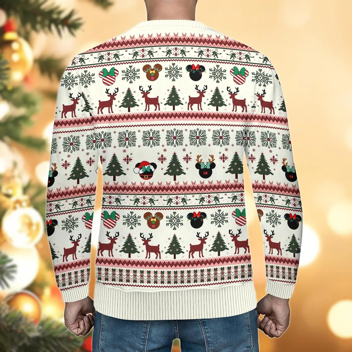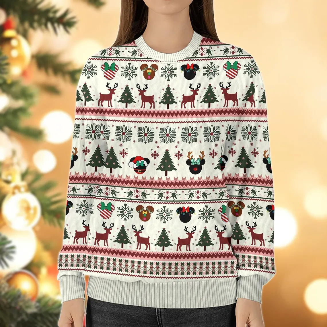 Get cozy this holiday season with this elegant Disney-themed Christmas sweater—featuring Mickey-shaped ornaments, reindeer, snowflakes, and festive trees!
