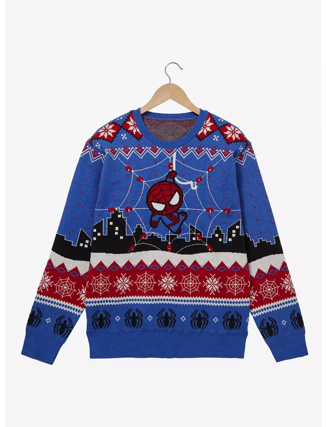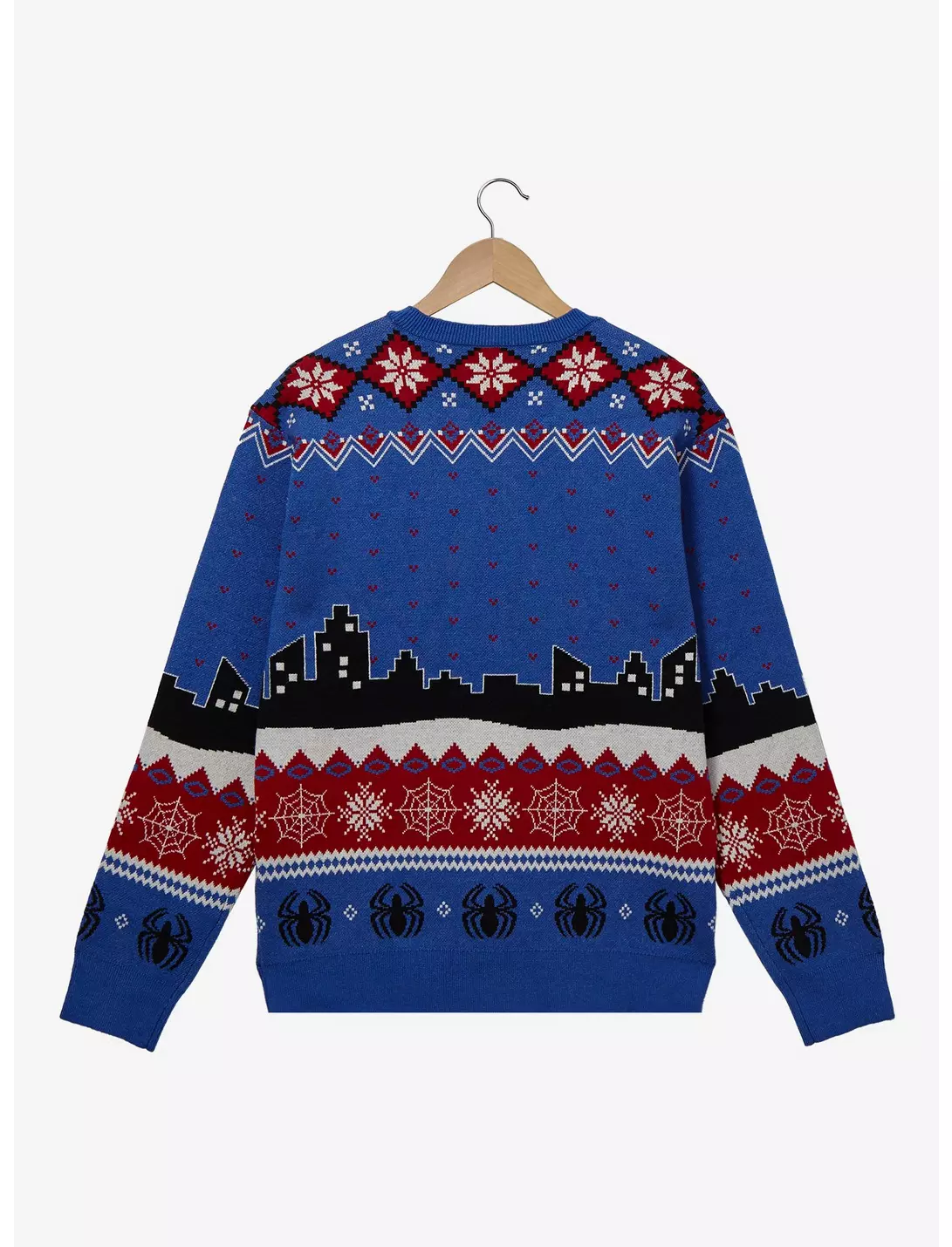 Add some web-slinging cheer to your holidays with this playful Spider-Man sweater, featuring a swinging Spidey, festive webs, and cityscapes—perfect for Marvel enthusiasts!