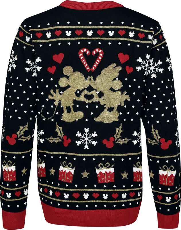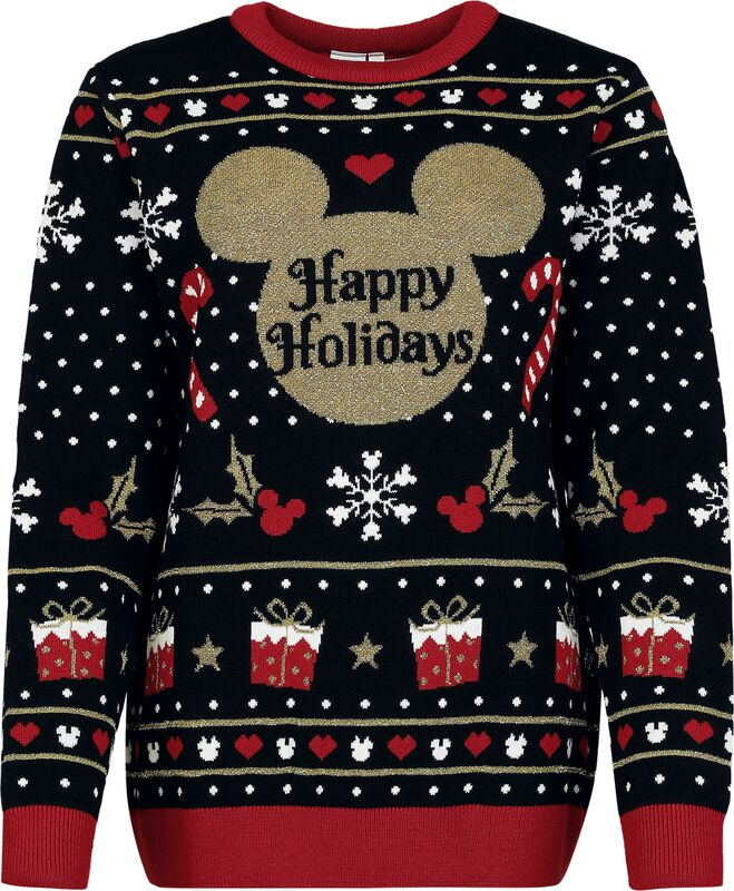 Add some Disney magic to your celebrations with this Mickey Mouse holiday sweater—featuring glittery gold accents, candy canes, snowflakes, and holiday cheer!
