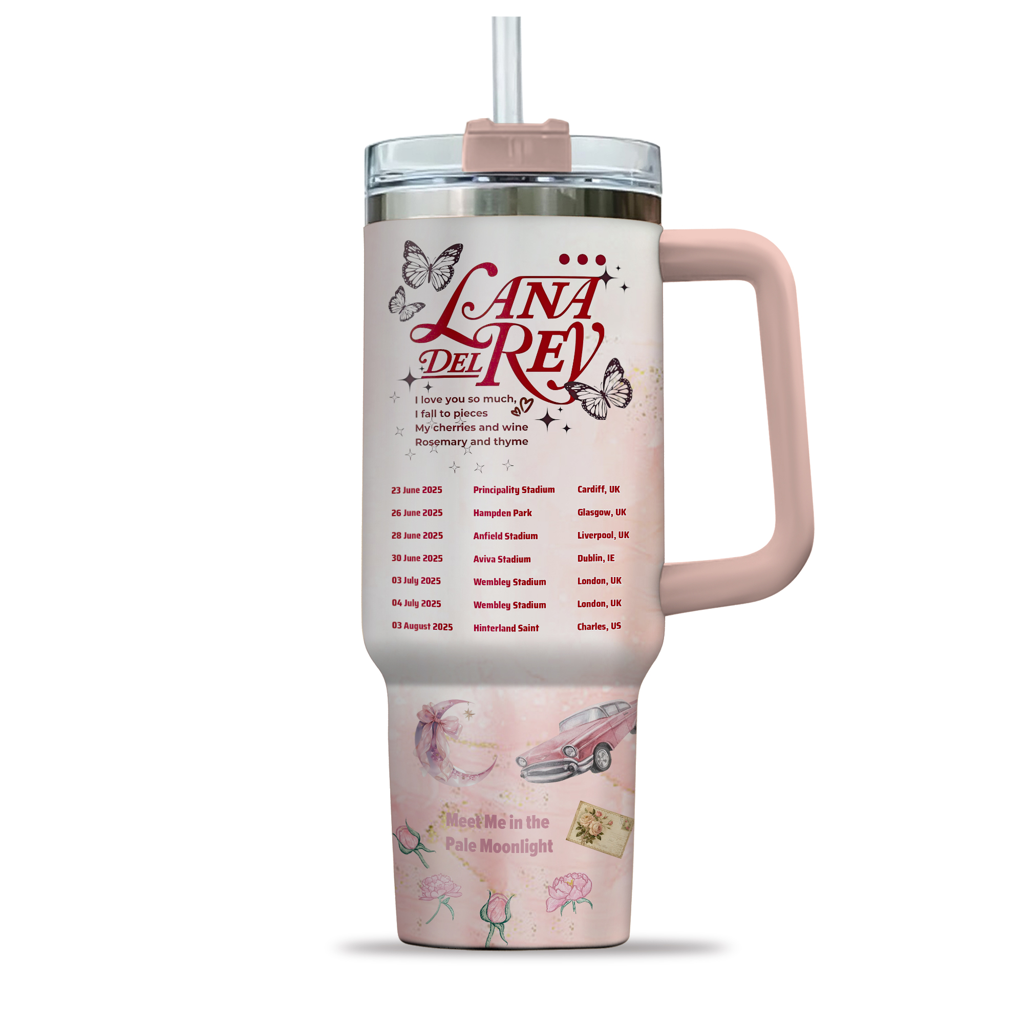 Step into a dreamy world with this elegant Lana Del Rey Stanley cup, celebrating her 2025 UK and Ireland Tour. Perfect for fans to “Meet Me in the Pale Moonlight.”
