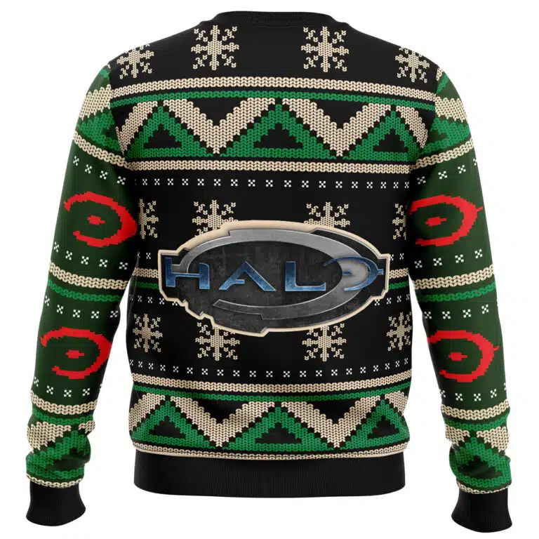 Festive Halo Christmas sweater packed with classic Spartan armor, wreath-wrapped hero vibes, and bold sci fi holiday flair perfect for fans who want iconic Master Chief energy.