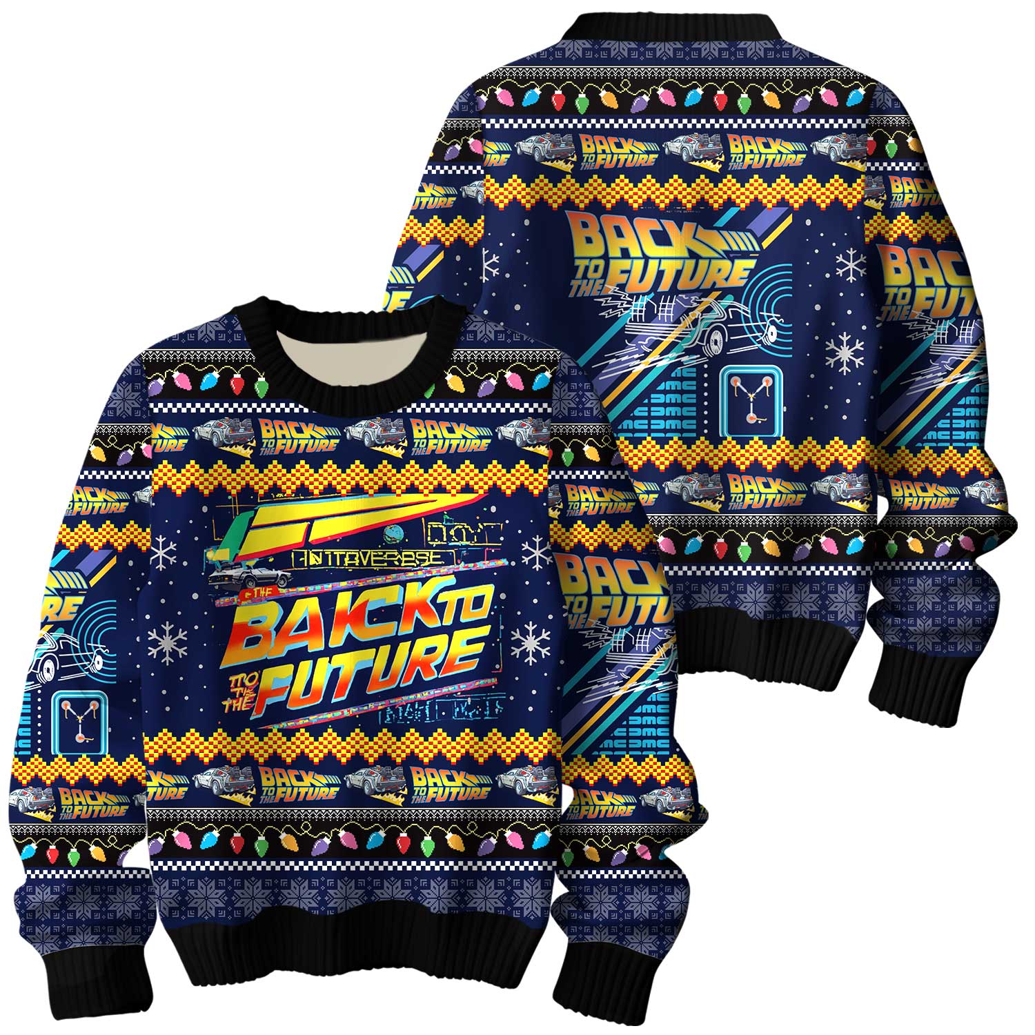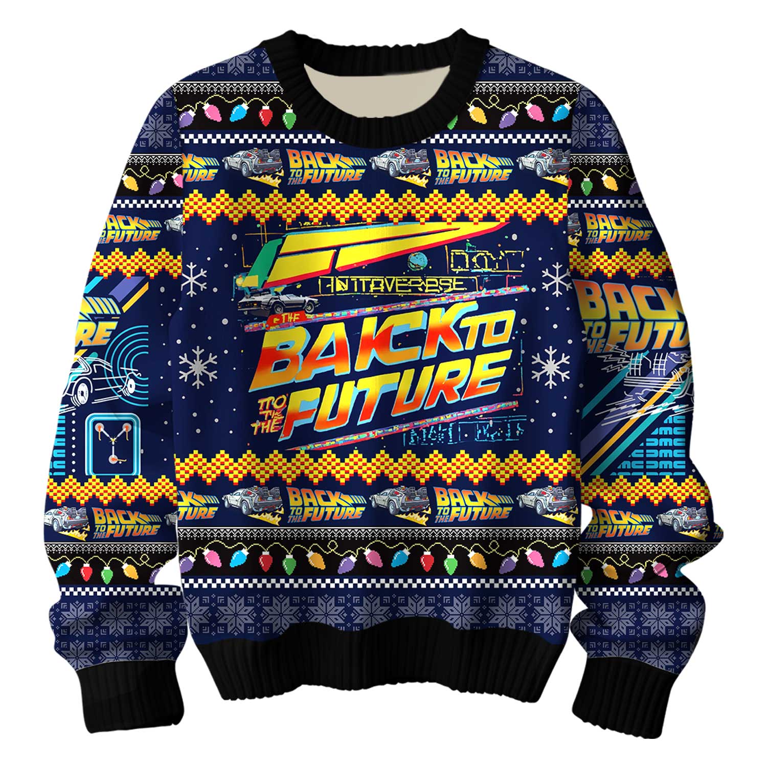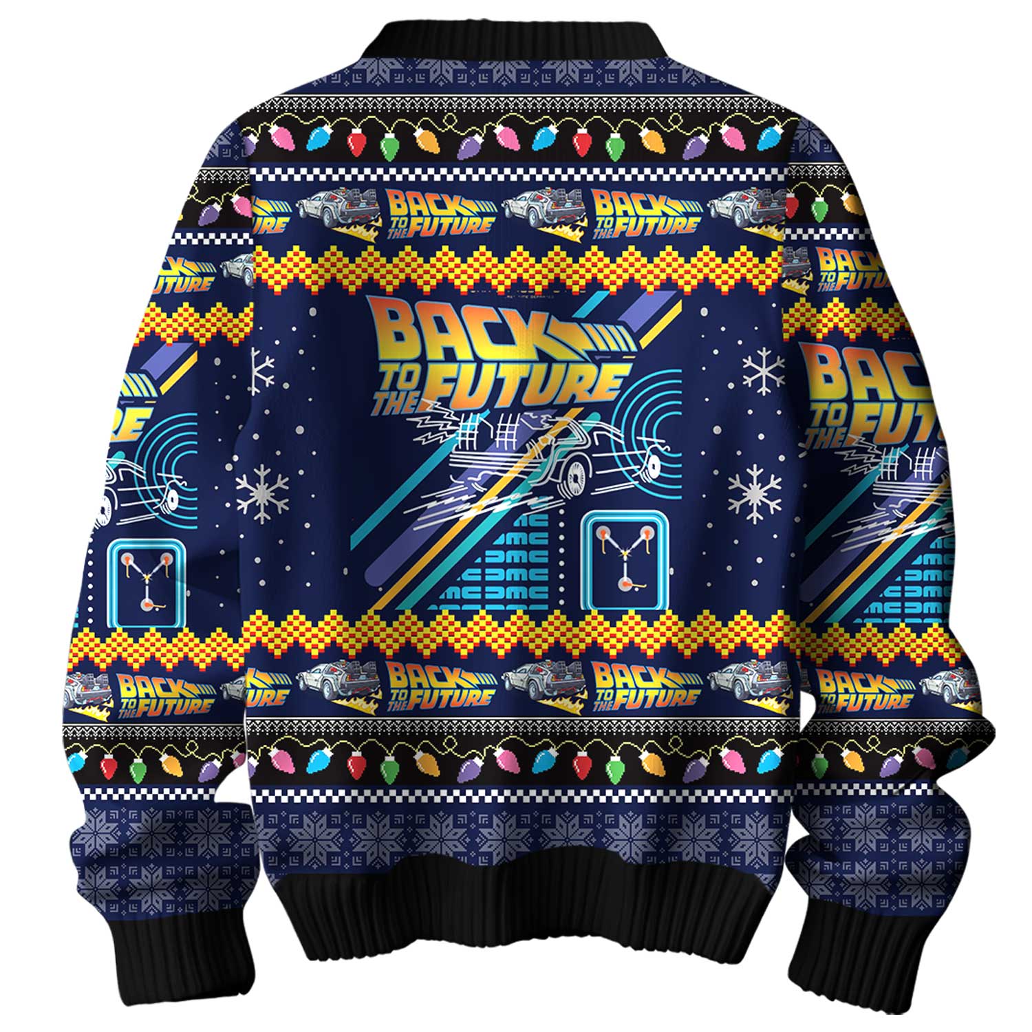 Gear up for the holidays with this Back to the Future-themed sweater, featuring a bold blue design, the DeLorean, and fun festive details, perfect for time-traveling celebrations!
