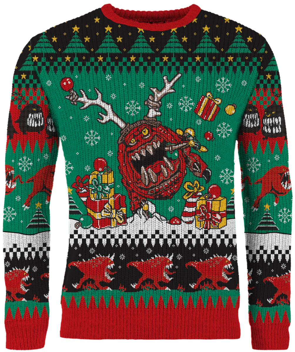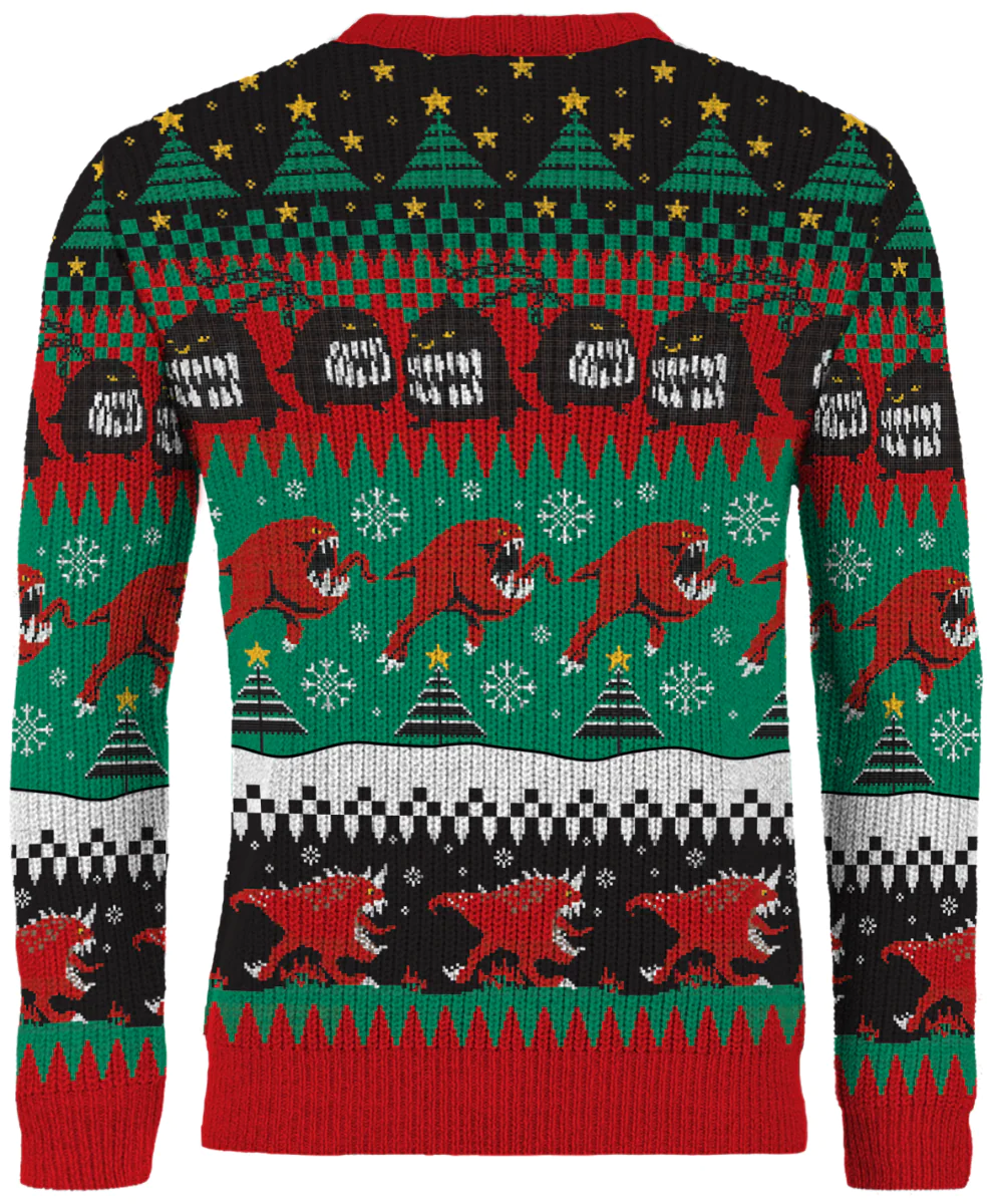 Festive Warhammer chaos-energy sweater with a wild squig centerpiece—bright, brutal, and perfect for fans who want Christmas with full Waaagh! spirit.