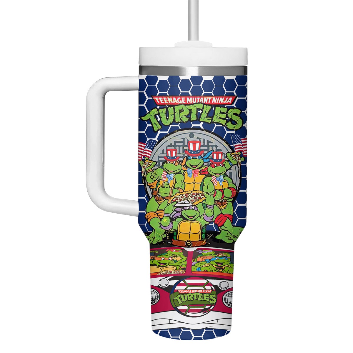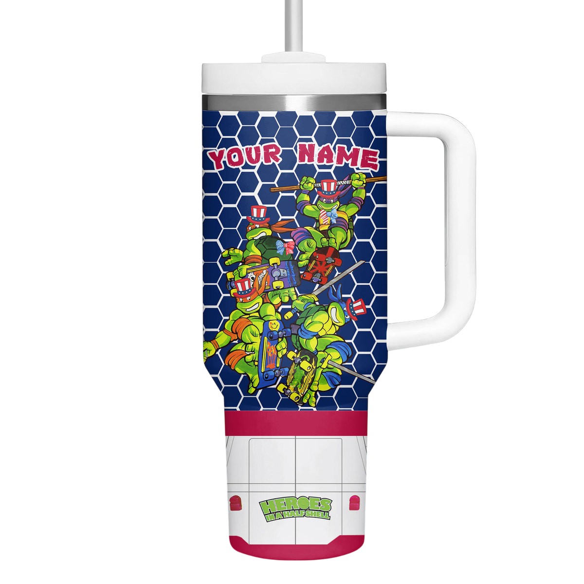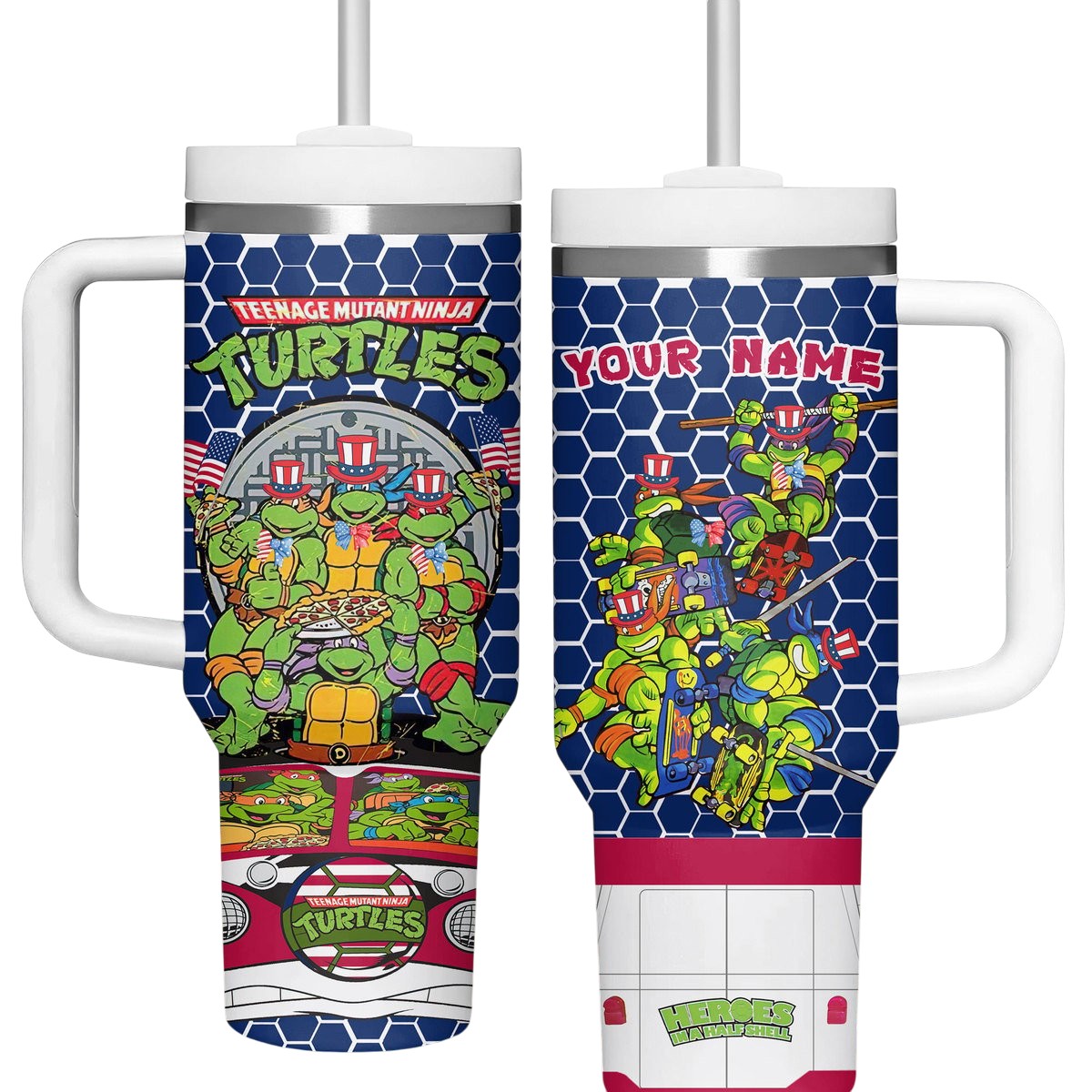 Celebrate in patriotic style with this Teenage Mutant Ninja Turtles tumbler—featuring red, white, and blue designs, customizable names, and the *Heroes in a Half Shell* showing their American pride!