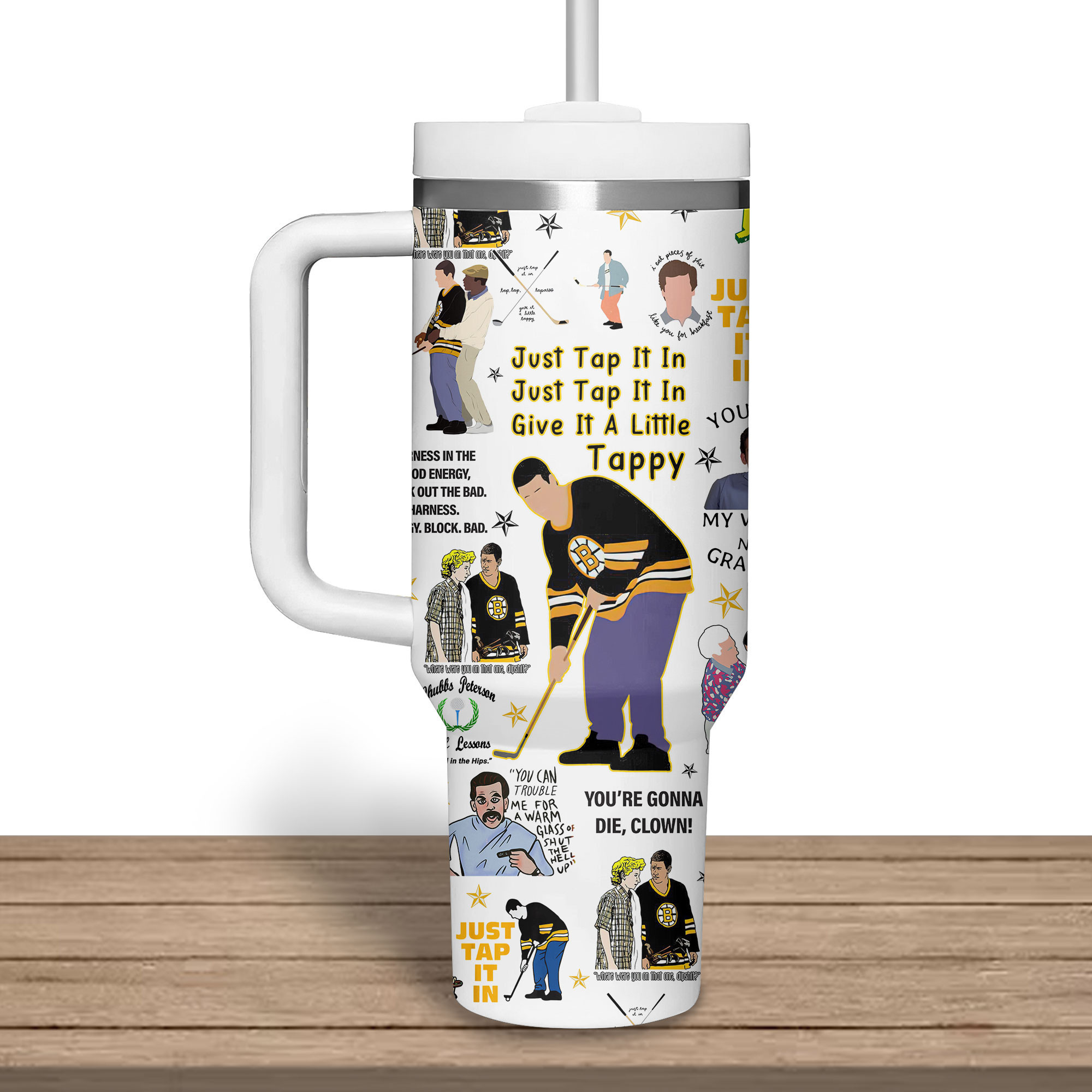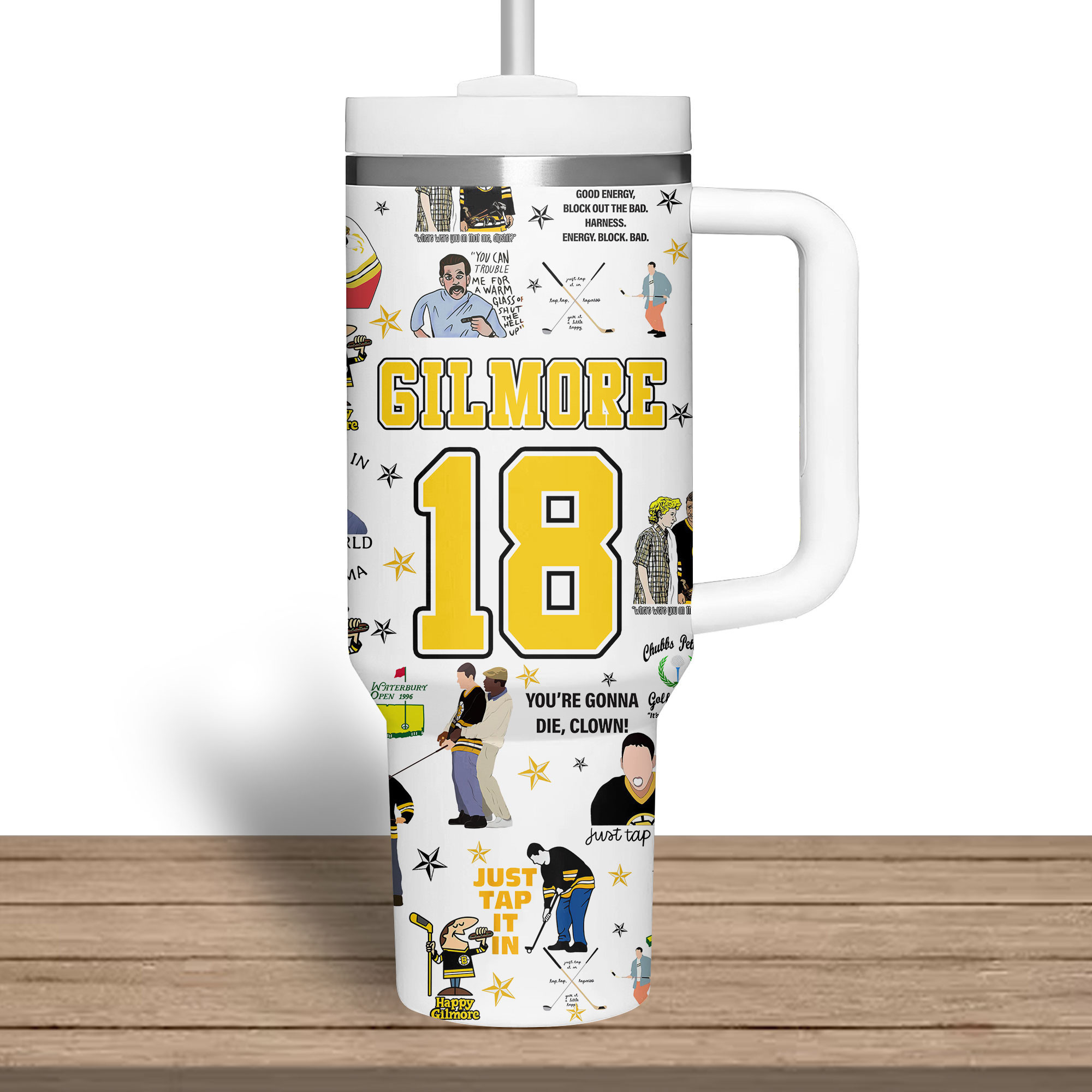 Channel your inner Happy Gilmore with this hilarious custom tumbler! Packed with iconic quotes and scenes, plus your own name and number, it’s a hole-in-one for fans of this comedy classic.