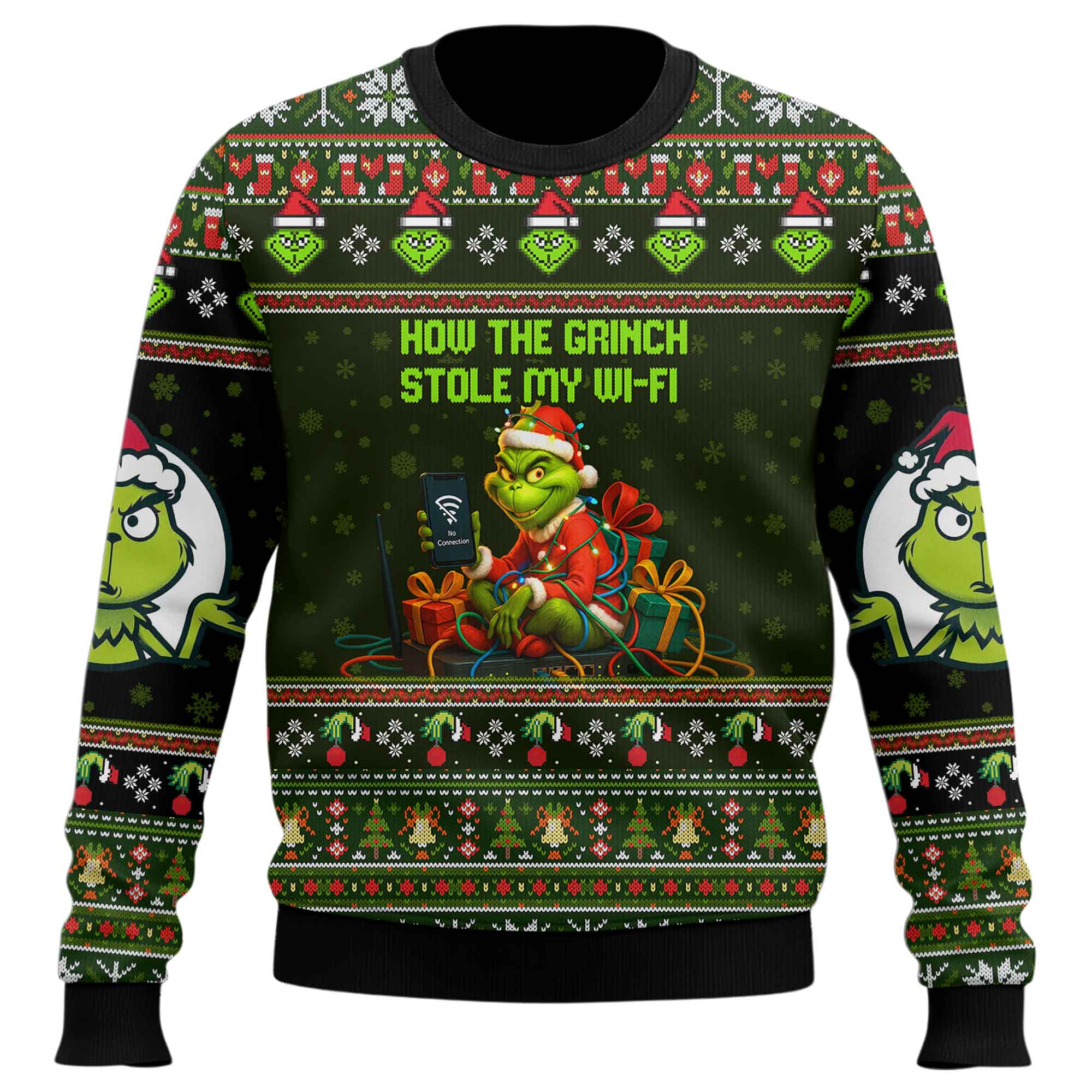 Add some techy humor to your holidays with this Grinch-themed sweater, featuring a Wi-Fi-stealing Grinch, “Christmas Loading” message, and festive patterns—perfect for gadget lovers and holiday pranksters!