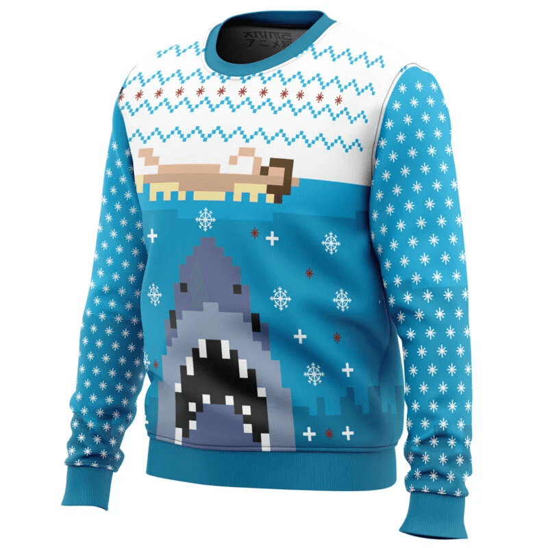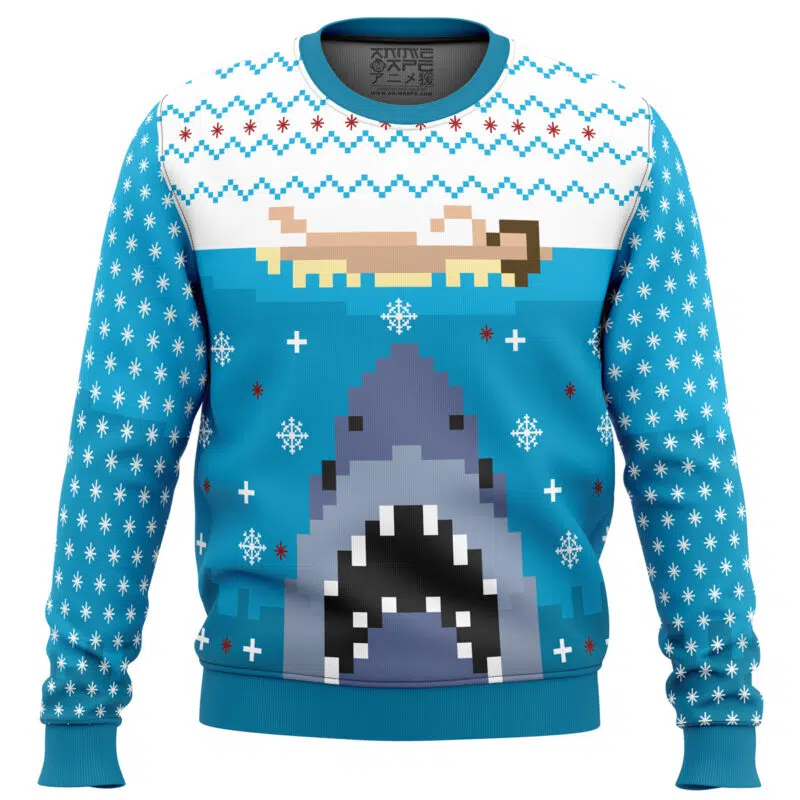 A playful pixel-style Jaws-inspired holiday sweater featuring a retro shark rising from the waves, mixed with classic winter patterns for a bold festive look.