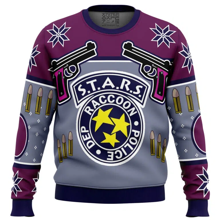 Tactical S.T.A.R.S. style with bold purple tones, iconic RPD insignia, and action-ready holiday energy for true survival-horror fans