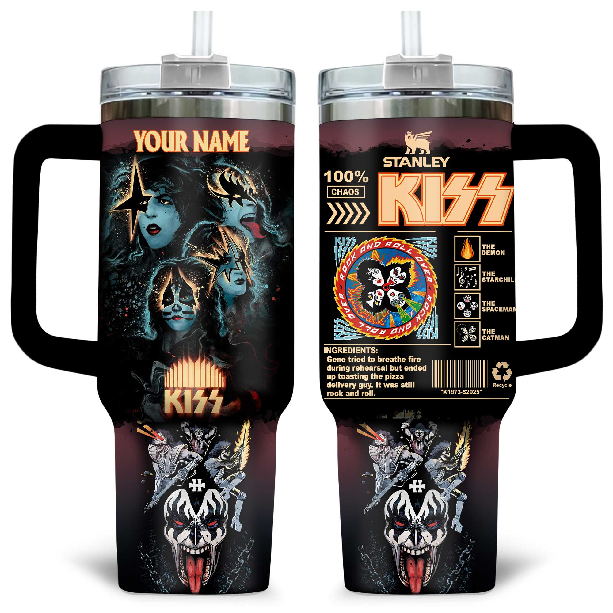 Rock and roll all night with this electrifying KISS tumbler! Featuring the iconic band members in their legendary makeup, fiery designs, and a tribute to their larger-than-life stage presence, this customizable tumbler is perfect for fans who embrace the chaos and energy of rock.