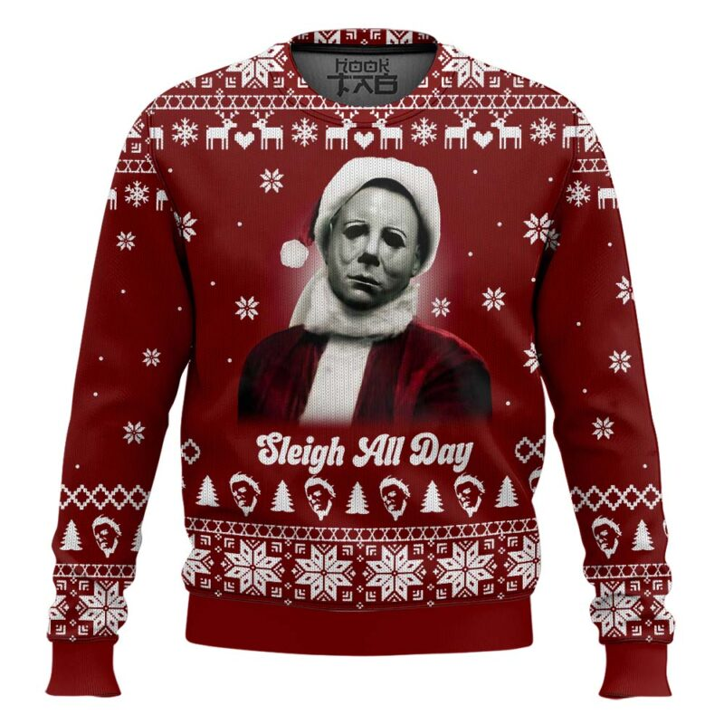 Dominate the holiday season with this ‘Sleigh All Day’ ugly Christmas sweater—featuring Michael Myers for a killer festive look!