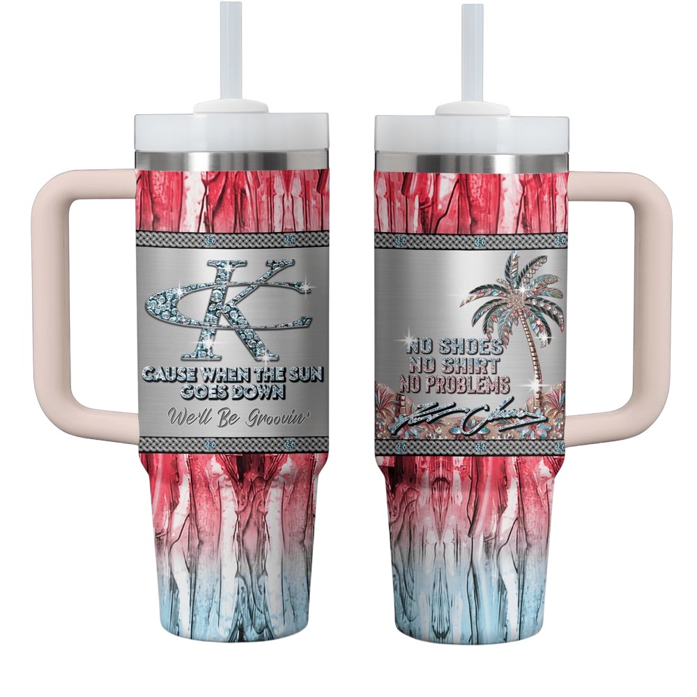 Stay groovin’ with this sleek Kenny Chesney tumbler! Featuring a metallic design, patriotic red, white, and blue accents, and iconic phrases like ‘Cause when the sun goes down’ and ‘No shoes, no shirt, no problems,’ it’s the perfect accessory for any country music fan.