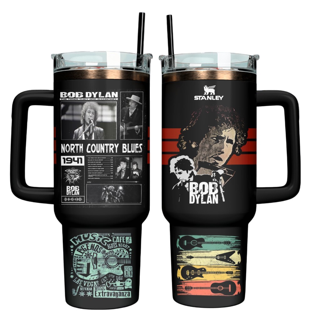 Celebrate the legacy of Bob Dylan with this sleek tumbler! Featuring images from his legendary career, references to *North Country Blues*, and vibrant music-themed artwork, this tumbler is perfect for fans who want to carry a piece of music history wherever they go.