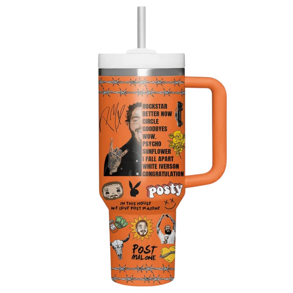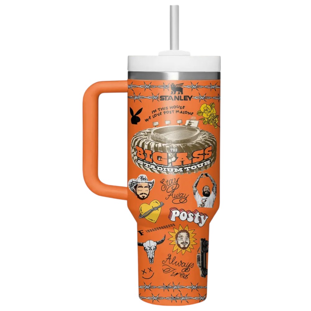 Show your Posty pride with this bright orange tumbler, celebrating the Big Ass Stadium Tour and featuring iconic song titles, playful graphics, and barbed wire accents—a must-have for every fan
