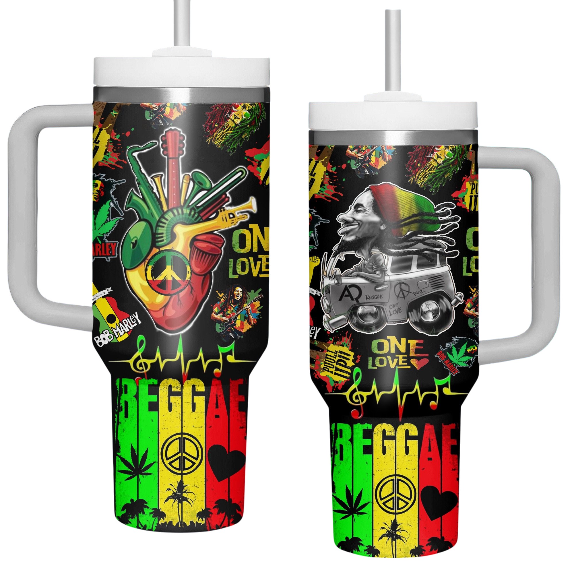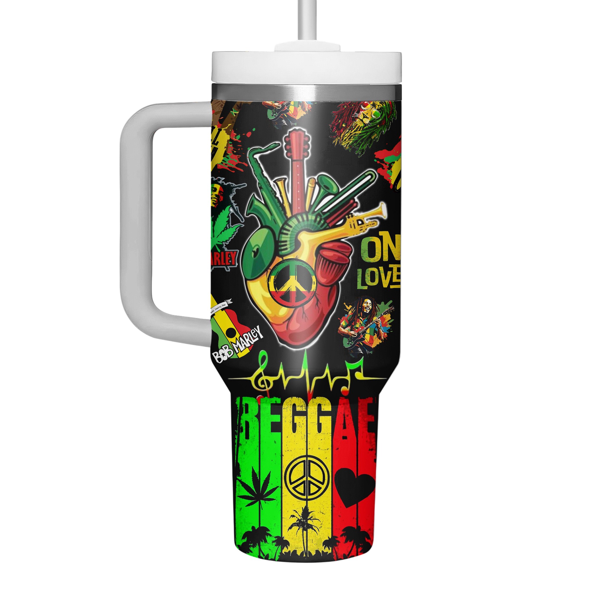 Celebrate the rhythm of reggae with this vibrant Bob Marley tumbler—featuring bold Rasta colors, musical elements, and the timeless message of *One Love* for a truly iconic design!