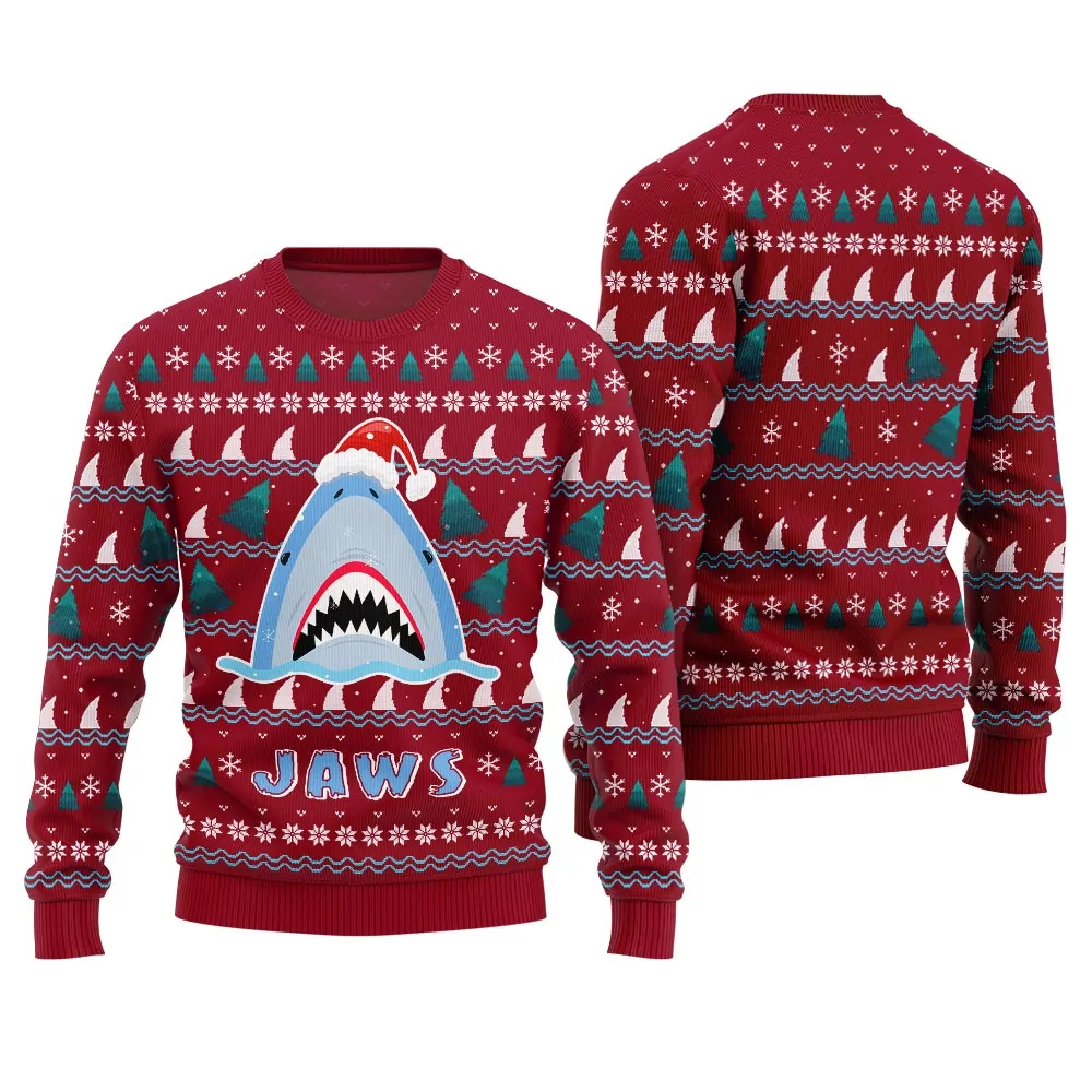 Take a bite out of the holidays with this festive red *Jaws* ugly Christmas sweater—featuring a Santa shark and holiday patterns for a cheerful yet toothy twist!