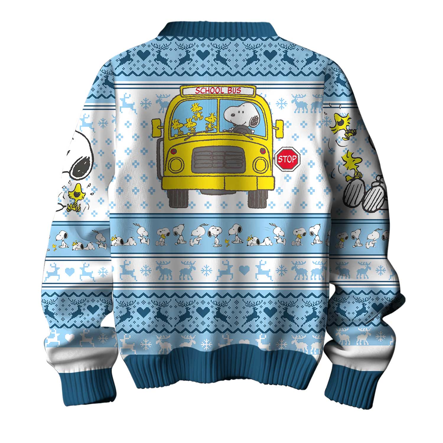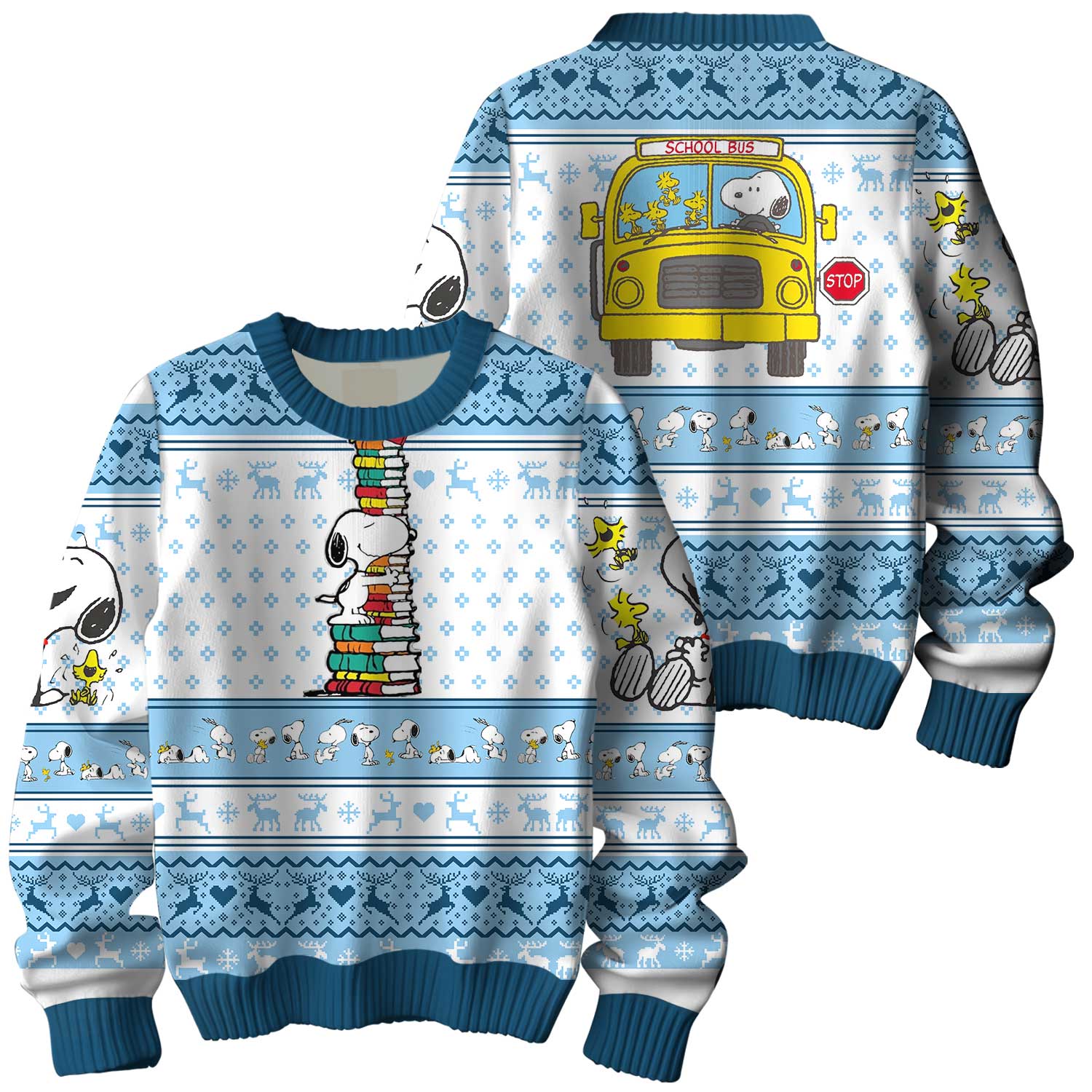 Cozy, durable sweater featuring soft blue patterns and a fun Snoopy book-stack and school-bus layout; adds playful charm and standout whimsical style.