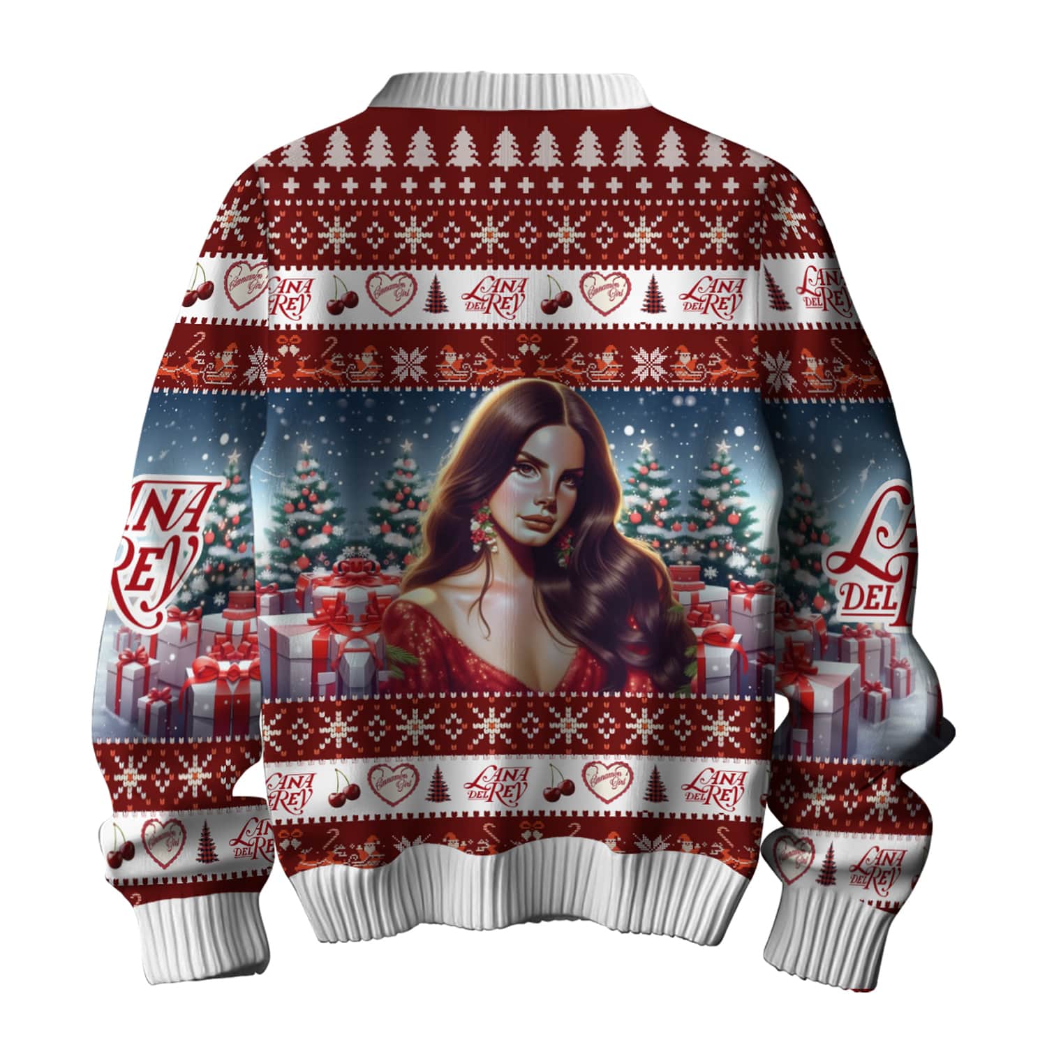 Celebrate the season in style with this Lana Del Rey Christmas sweater, featuring her festive portrait, gifts, and snowy charm—perfect for fans!