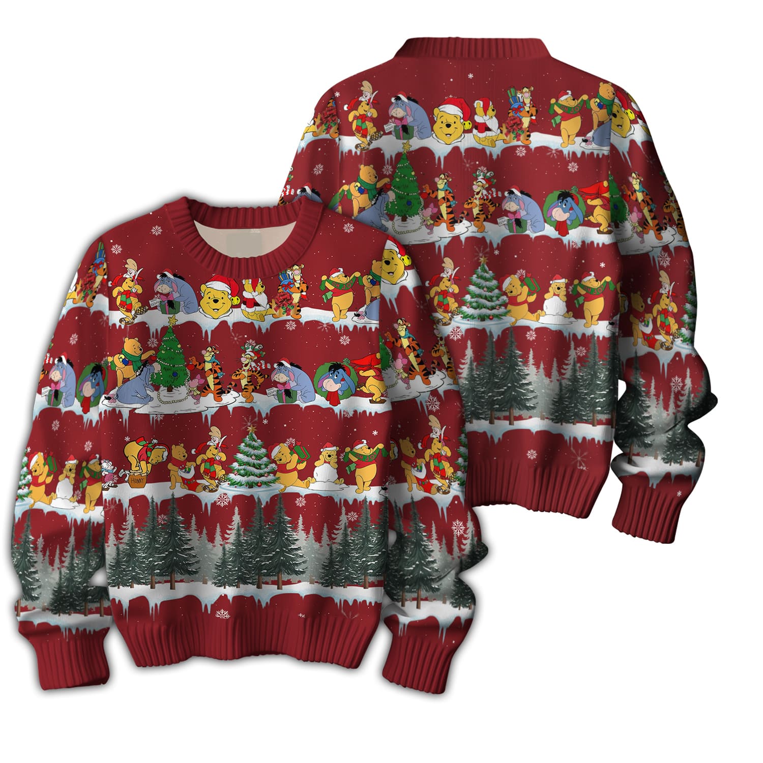 Festive Pooh sweater packed with joyful holiday scenes, snowy forests, and bright Christmas energy.