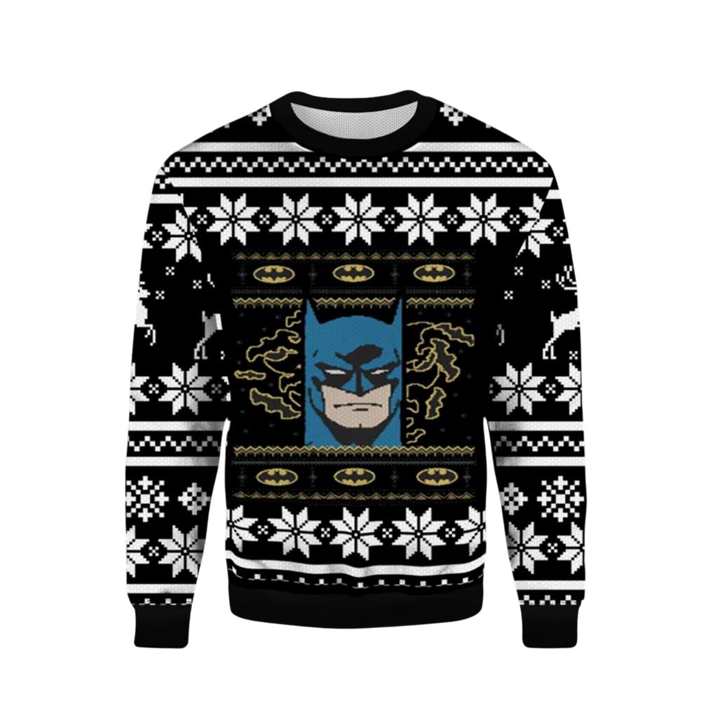 Stay cozy and heroic this holiday season with this classic *Batman* sweater! Featuring a bold portrait of the Dark Knight framed by festive snowflakes, bat symbols, and a black-and-white winter pattern, this sweater is perfect for fans bringing justice to their holiday celebrations.