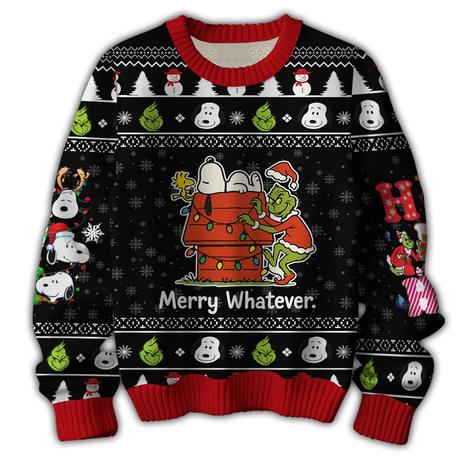 “Merry Whatever” vibes with the Grinch and Snoopy—perfect for holiday grinches and dog lovers who say, “Ew, people.”