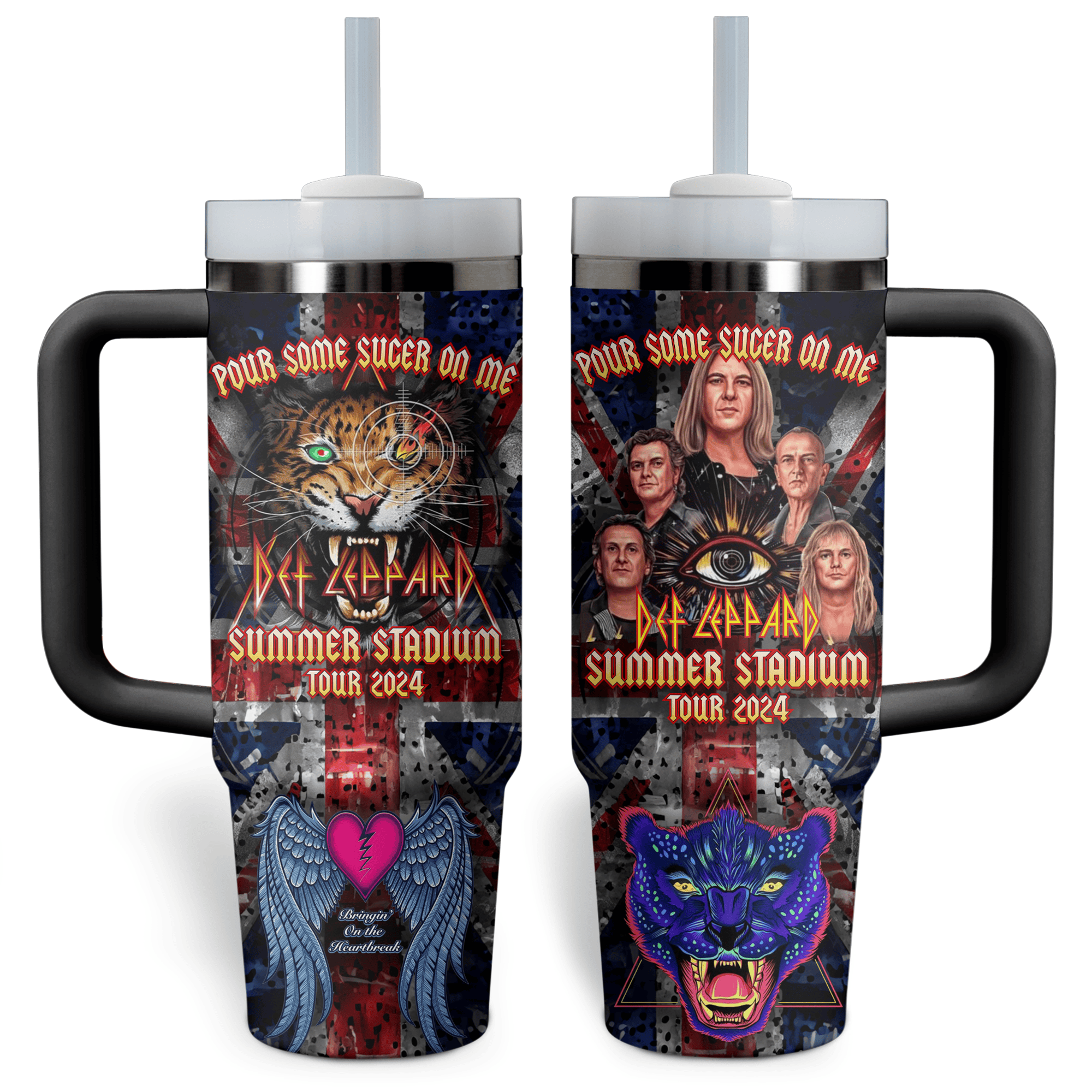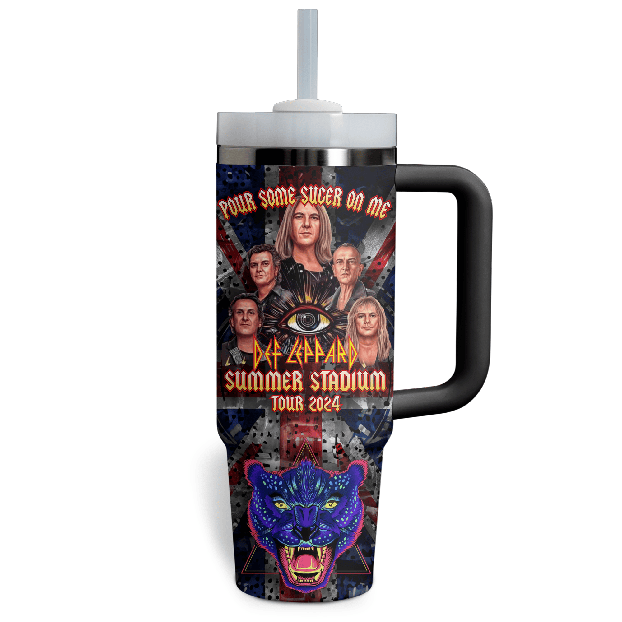 Celebrate the Def Leppard Summer Stadium Tour 2024 with this epic tumbler featuring fierce artwork—complete with roaring leopards, band portraits, and the iconic “Pour Some Sugar on Me” tagline. Perfect for rocking out in style!