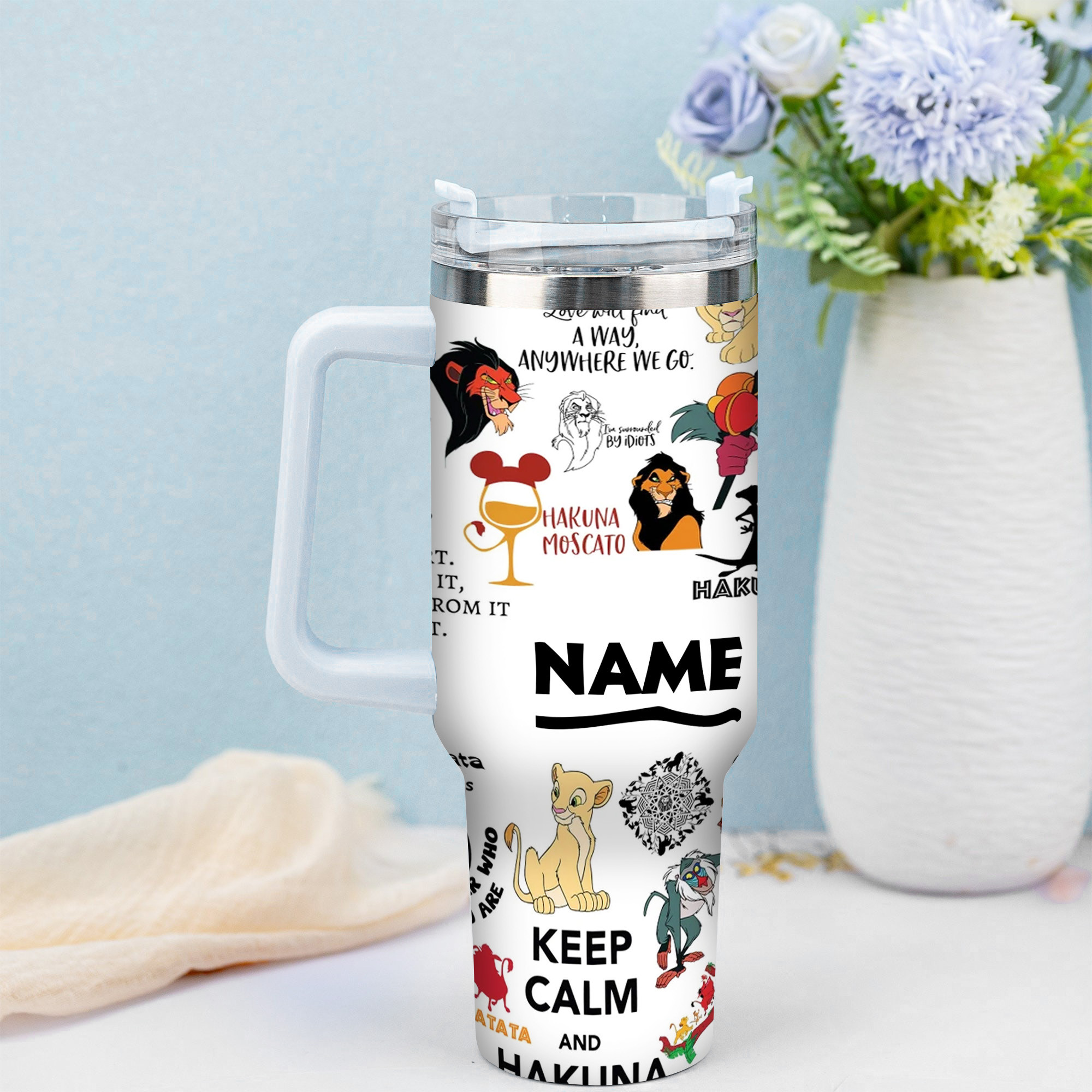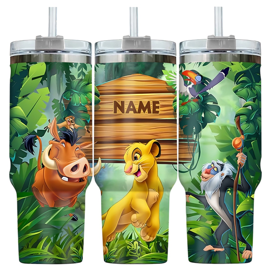 Add a touch of adventure to your day with this fun and vibrant Lion King tumbler! Featuring Simba, Timon, Pumbaa, and Rafiki in a lush jungle setting, it’s customizable and perfect for fans of all ages.