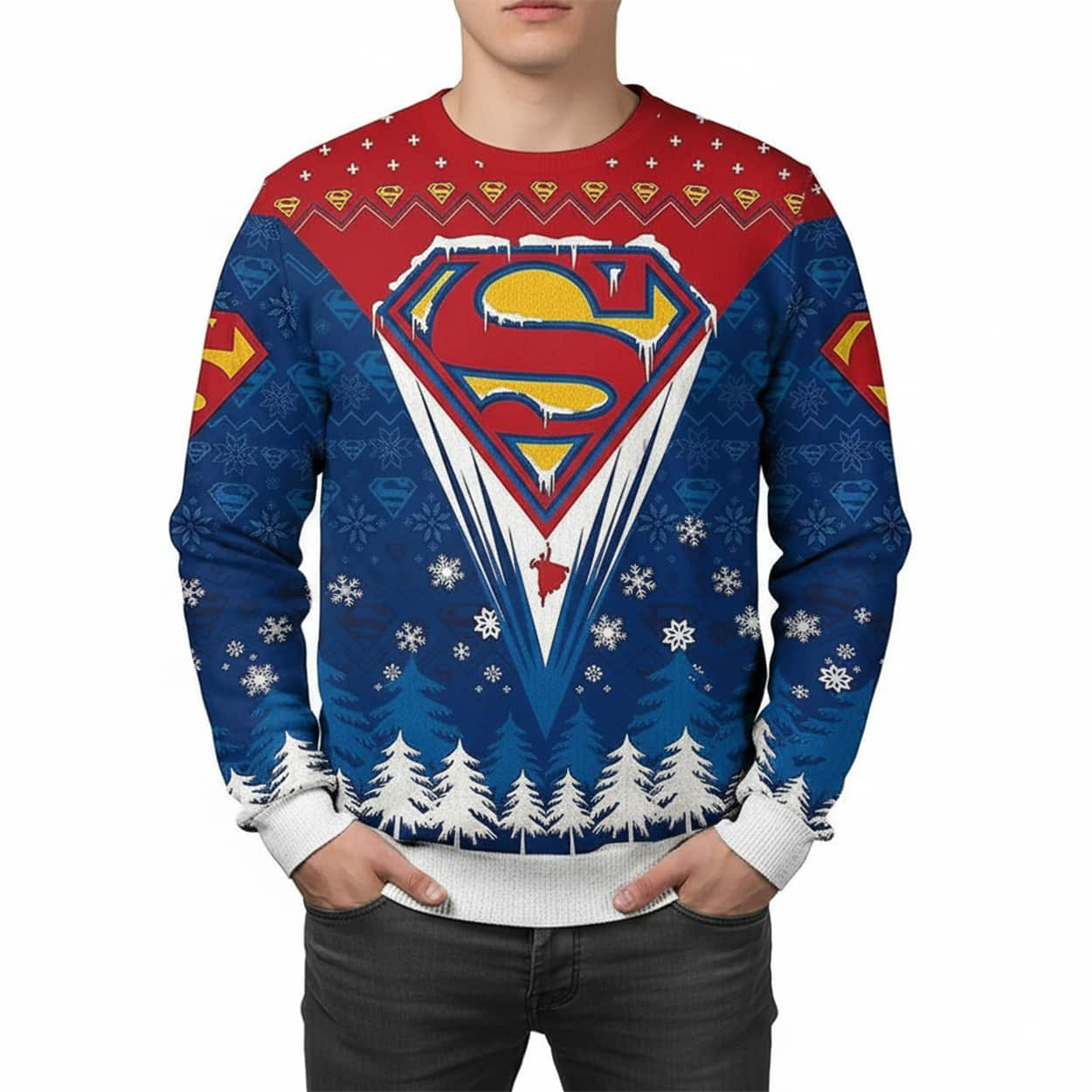 Show off your festive superpowers with this bold Superman-themed Christmas sweater, featuring snowy trees and the iconic “S” shield—perfect for saving holiday celebrations!