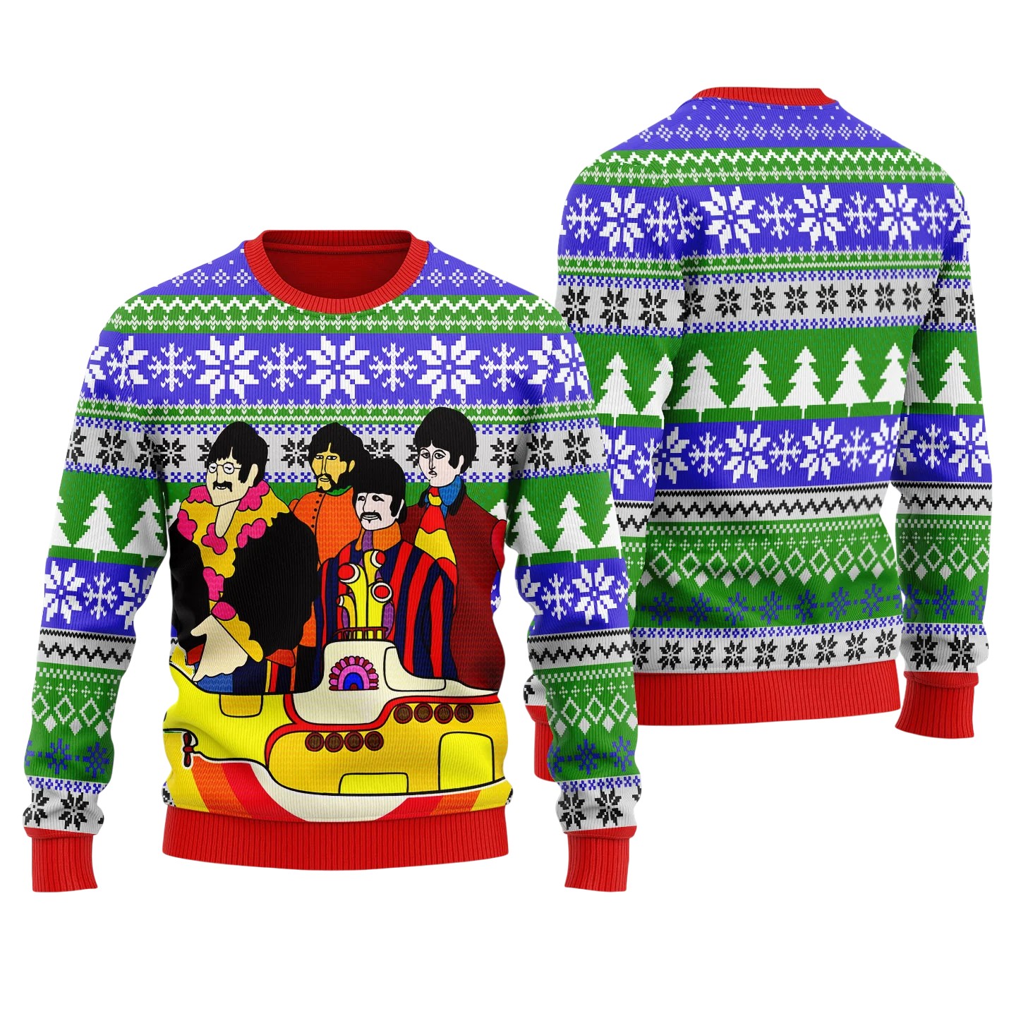Spread holiday cheer with this vibrant Yellow Submarine-themed Beatles sweater! Featuring the Fab Four in their iconic psychedelic style, surrounded by festive snowflakes and trees, it’s the perfect blend of music and holiday spirit for Beatles fans.